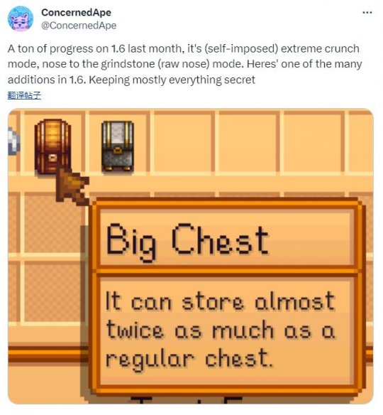 《星露谷物语》的作者ConcernedApe近日再次发文透露了游戏1.6版本的情报,他表示在上个月,1.6版本已经取得了巨大进步,但目前该版本还正在开发中。另外,在1.6版本中还将添加新物品“大箱子”,它能装近乎2倍普通箱子的物品。