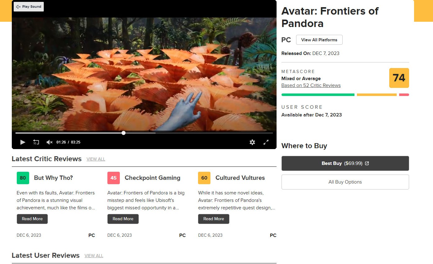 《阿凡达:潘多拉边境》媒体评分解禁,IGN给出7分。 IGN评分:7分 IGN表示,《阿凡达:潘多拉边境》有着一个非常震撼的外星球可探索,但并没有什么像其他现代开放世界游戏那样包含许多真正的惊喜。 IGN总评: 《阿凡达:潘多拉边境》拥有一个令人惊叹的外星世界供玩家探索,其导航方式令人耳目一新,有无数的敌人基地需要摧毁,有无数的纳美部族支线任务需要完成,也不乏奇异的动植物可供玩家收获和猎杀。然而,它的战斗相当单一,任务设计有点重复,环境除了视觉上的华丽之外,总体上缺乏任何重大惊喜,这意味着《阿凡达:潘多拉边境》是一款扎实的射击冒险游戏,但更多地停留在传统范畴而非真正超越边界。 MTC评分:74分(PC) 其他媒体评分: |