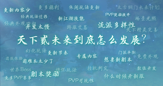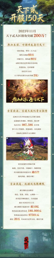 热血未凉,再行天下征程!自7月6日开服以来,《天下贰》开服已超150天,许多少侠亦借此机会重回大荒,再次与天下IP并肩前行,共同成长。 自6月6日《天下贰》即将回归的消息首曝后,便引起众多少侠的关注,有超60万的少侠一同等待重回《天下贰》的那天。在开放预创角后,仅3天的时间,少侠边创建了20万位角色,使得官方采取紧急扩容的措施以接纳更多少侠。开服首日,大荒内更是热火朝天,创角数量超80万,少侠们呼朋唤友再战天下。早在今年10月,《天下》IP历史累计玩家突破了2亿,其中天下贰大区功不可没,截止至2023年11月,天下贰大区的创角数量超过了200万! 回首与少侠们共同创造的历史,亦不忘展望未来更好的大荒。《天下贰》受到万众的瞩目与支持,与此同时,开发组亦收到了不少来自少侠们的疑惑——“天下贰未来到底怎么发展?”为了让大家了解更多关于天下贰大区的规划,开发组将针对反馈中具有代表性的问题,一一进行解答。 重回那个人魔激烈冲突的年代,在险象丛生的太古铜门战场中,无数少侠手执利刃,与入侵者殊死搏斗。他们跋山涉水,足迹遍布英魂原、朔风漠以及陨石野地区的每一个角落。 与此同时,大荒内的各类PVP玩法也是轮番上场,点燃少侠们的战斗激情。最近,首届征战四方热血开战,天下贰四大服务器,共组建分堂逾百个,百团大战即刻点燃,大荒硝烟四起,少侠们在战斗中回味昔日激情岁月。 藏宝阁内一派繁荣,各类商品琳琅满目,少侠们自由进行买卖交易,进一步深化彼此间的交流,以物变现,促进共同发展,实现双赢局面。 这种种瞬间,汇聚成一个个数字,足以铭刻天下贰与少侠们的深刻羁绊…… 线上游戏内人气火爆,线下亦同样热闹非凡。 从满载天下事的深圳地铁列车、广州小蛮腰下镌刻天下回忆的环城巴士,再到尽显大荒魅力的成都太古里盈嘉3D大屏和春熙路地铁站,还有带你穿越回2008年,重现激情岁月的天下时光网吧…… 《天下》突破次元界限,跨越山海异世,与少侠们在现实中相遇,送来满满的祝福与感恩,邀请大家共话当年天下事,也号召着少侠们重回故地,再度征战大荒。 天下贰的未来将何去何从? 在开服的150天里,《天下贰》受到了广大少侠们的高度关注。一方面,热爱《天下贰》的大家不断地向开发组反馈着自己的各种需求和困惑,希望得到进一步的解答;另一方面,开发组也通过对各个社交平台上玩家意见的收集、“五城之约”线下交流会中的深入交流中,更好地了解到了大家的意见和疑虑。 这诸多问题,其实都可以归结为一个问题,那就是——“天下贰未来到底怎么发展?” 接下来,策划将针对反馈中具有代表性的问题,进行解答。后续,官方微信公众号还将推出更多的爆料推文,对重点问题进行详细说明。 “太古太肝啦!而且玩法也比较单一,有没有考虑出战场之类的丰富一下玩法?” 在此,开发组首先要回应大家的是,未来太古铜门还会有更多的内容补充,最近上线的“雪崖猎场”就是开发组对太古铜门内PVP玩法的一次尝试,未来也会推出更多内容,包括限时的PVP和PVE活动,让这个大地图继续“发光发热”。 而针对太古铜门将阶等级较低、进度较为落后的少侠,开发组已在持续探索相关办法来降低追赶难度,比如此前在太古铜门内的声望商人中上架的奋发秘药,帮助大家提升武绩获取效率;还有烽火战令的补救道具,帮助少侠们更轻松地完成甲等兵劫,获得事迹和探索度等奖励。后续,还将继续推出更完善的解决方案,让大家的太古铜门之旅能够少“肝”一些。 “目前副本玩法好无聊!后续会考虑如何调整?” 对于不少少侠所热衷的PVE副本玩法,开发组亦将计划对其进行优化调整。近期上线的【熔岩镇祸】副本仅仅是一个开始,后续将在《天下贰》中推出更多精彩的副本,每个副本都将带给少侠独特的游戏体验。 目前,开发组已经启动了一个规模宏大的副本关卡制作,旨在为少侠们呈现犹如置身于《山海经》上古传说中的真实体验。力求将远古的神话世界再现于眼前,让少侠们在战斗中感受到副本本身的震撼与魅力。 与此同时,针对少侠们挑战频率相对较低的经典副本,开发组会对其进行复刻和重构,同时适度提升难度,力求为大家带来更具挑战性的游戏体验。更具挑战性的经典副本,也有着更具吸引力的奖励掉落,比如产出稀缺外观等资源,欢迎大家后续积极参与经典副本的玩法哦~ “现在的PVP不好玩,奖励也不吸引,你们打算怎么改?” 开发组深知,许多少侠对PVP竞技充满热情,正因如此,开发组也将持续开发更多精彩的PVP玩法作为一项重要的工作,以满足广大少侠的需求。从近期的首届征战四方到本周更新后拉开序幕的3V3武神竞技赛,从大规模团战到小型竞技,开发组致力于在实践中挖掘更适宜天下贰玩家的PVP玩法。 在不久的将来,既有大规模的、更刺激的团战类型玩法推出,带给大家全新的体验,也会有更多的PVP独占奖励,以足够的吸引力鼓励大家参与其中。 当下,少侠们已经非常习惯世界Boss相关的大型战役,未来开发组还将考虑在这样的玩法中,加入争夺类机制,让大家以实力争夺世界Boss的归属权,提升团队凝聚力的同时,也以更强的对抗性,点燃大家的战斗激情。此外,开发组还将增加以势力为单位富有策略性的新玩法,继续丰富大家的PVP体验,各位少侠可以期待一下哦~ “升完将阶后没追求了!天下贰后续的更新节奏是怎么