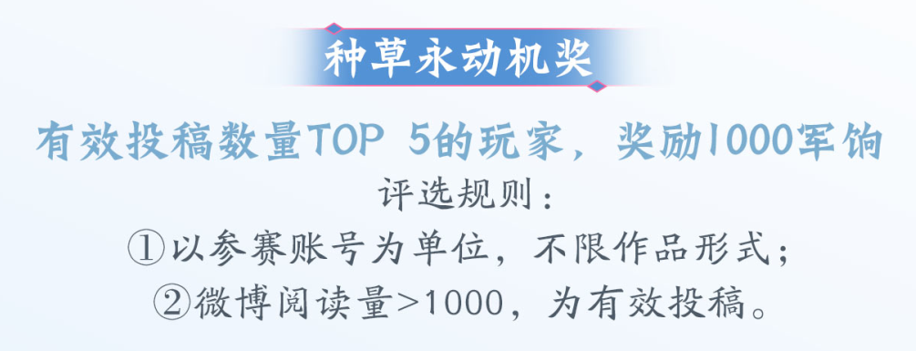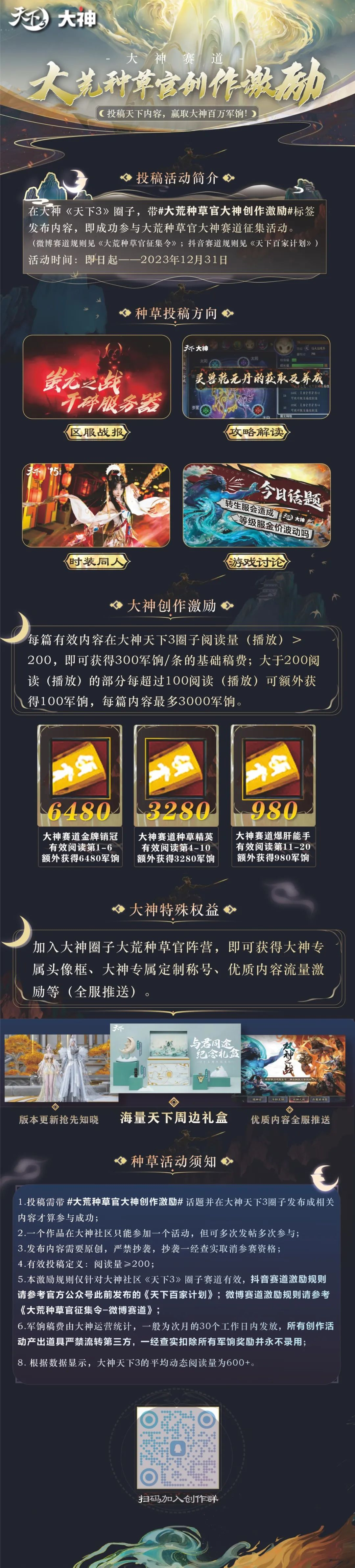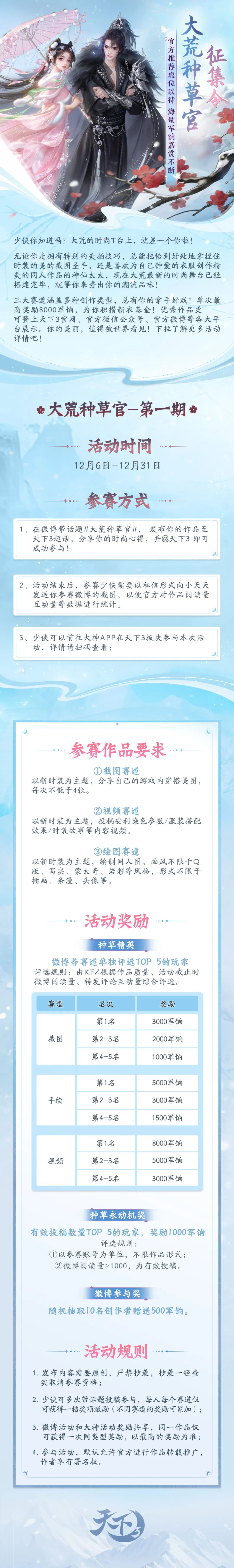 近日大荒各地雪花纷飞,昔日繁茂的大地如今披上银装,变得一片洁白。不少少侠亦纷纷换上新衣,出门游览并享受冬日美景,同时不忘拍照,记录下美丽瞬间,与亲友们分享讨论。昨日,《天下3》宣布推出“大荒种草官”活动,旨在为大家提供一个自由创作的空间,让少侠们可以尽情挥洒创意与才华。即日起-12月31日,少侠只需拍下穿着新时装的美照,或是为新时装创作同人作品,发到微博参与“大荒种草官”活动,不仅有机会获得官方推荐,还能获得海量军饷作为嘉赏,单个作品最高可获8000军饷奖励! 事不宜迟,下面一起来看看活动详情吧~ 三大赛道任君选择,总有你的拿手好戏 第一期活动共分为截图、视频、绘画三大赛道。 无论你是拥有独特的美拍技巧,能完美呈现各款新装的魅力,还是富有强大的创作能力,为自己喜爱的新衣制作同人视频、绘制画作,都能在本次活动中,找到合适的赛道,发挥自己的全部实力~ 少侠选好赛道并准备好作品后,就可以前往微博平台,带话题?#大荒种草官#?在天下3超话内发布作品、分享心得啦。最重要的是别忘了@天下3?,才会视为成功参与哦~ 活动结束后,参赛的少侠还需要私信天下3官方微博账号,发送自己参赛微博的截图,以便开发组对作品的各类阅读数据进行统计~ 三大奖项重磅登场,海量军饷拿到手软 本期活动共划分三大奖项,分别是种草精英、种草永动机和微博参与奖,其中,种草精英奖将分赛道进行评比。少侠可以多次带话题参与投稿,但每人在每个赛道只能获得一档奖励,不同赛道的奖励可以累加。种草精英将选出每个赛道的前五名少侠进行奖励,单赛道最高可获得8000军饷奖励!作品质量、活动截止时的微博阅读量、转发评论互动量等都是评选的重要指标。 种草永动机则鼓励少侠们多多发布作品,只要阅读量大于1000,就视为有效投稿。有效投稿前5的少侠,每人均可获得1000军饷作为奖励! 除了上述两项,开发组还准备了微博参与奖,鼓励更多少侠参与大荒种草官的活动。 在一众创作者中,将抽取10位少侠,每人送出500军饷!也就是说,只要少侠参与了活动,就有机会被抽中哦~ 看完以上介绍,少侠们都对本次的“大荒种草官”活动有了更深入的了解了吧?接下来不妨继续下滑查看活动长图,了解更多资讯,以便尽快参与其中! 除了微博,少侠们还可以在大神平台参与活动,同样可以获得大量军饷作为创作激励!与此同时,加入大神圈子的大荒种草官阵营,还能享受大神专属头像框、大神定制称号、优质内容流量激励等特殊权益,想了解更多相关资讯吗?赶快往下查看活动海报吧! 以上就是今日为大家带来的大荒种草官第一期活动资讯。晒出新衣美照,领海量嘉奖!各位大荒时尚达人、艺术家,准备好参与活动,晒出你的美丽了吗?后续更多活动内容,大家敬请关注天下3官方公众号以及微博账号哟~ |