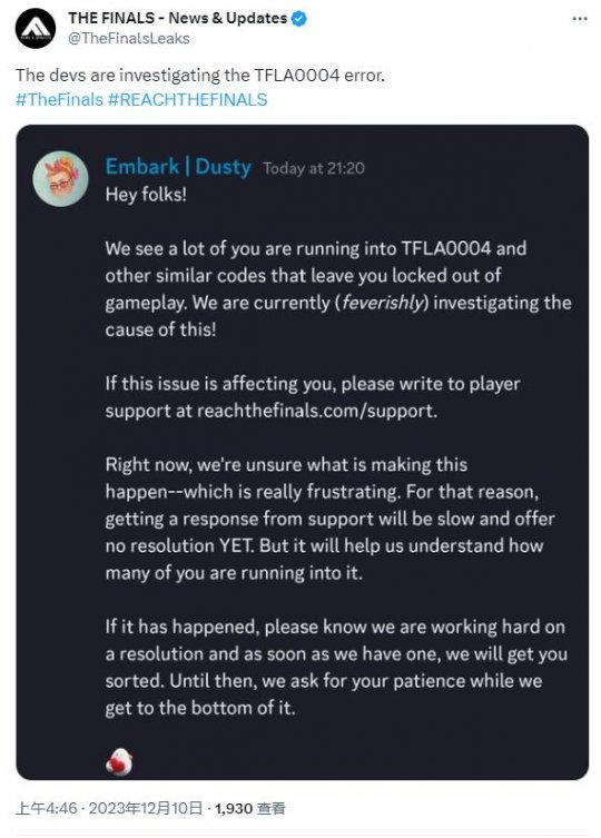 由前《战地》开发人员打造的免费多人射击游戏《The Finals》在正式发售后,于Steam上达到了同时在线24万人的峰值,并且收获了多半好评的评价。 不过随着游戏人数的增加,游戏的外挂问题也不可避免地出现,只是近日有不少玩家发现,自己并未开挂,却遭到疑似外挂认定,而被封禁了账号。 有这样问题的玩家都在进行游戏时弹出了“TFLA0004”代码错误页面,由于《The Finals》使用的是“Easy Anti-Cheat”反作弊系统,这一代码意味着玩家可能存在使用漏洞或作弊行为,而被封禁了账号。 随着越来越多的报告,官方也开始注意到相关问题,并在官推上表示正在对“TFLA0004”代码错误原因进行调查。 有玩家推测发生这样的问题,可能是PC端玩家使用了手柄外设所导致的,但目前尚未有定论,被误封的玩家只有联系Embark Studios,提交申请表格来等待官方解决。 |