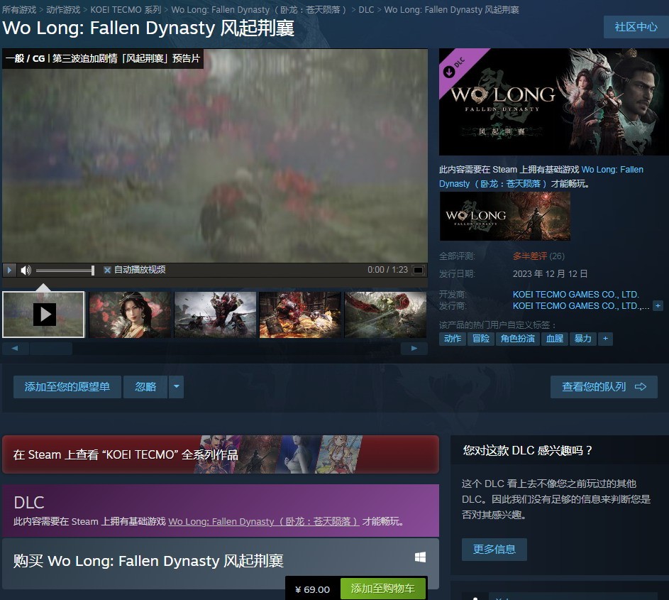 《卧龙:苍天陨落》新DLC“风起荆襄”发售 国区售价69元