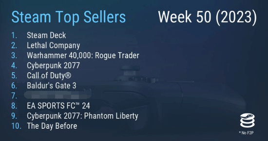 2023年仅剩最后半个月,Steam的每周销量数据也统计到了第50周。作为TGA年度游戏展结束后的第一周,本期数据算是个分水岭。之后新推出的游戏作品,都将被划分到2024年这个区间。而此次的Steam周销榜前十,其中绝大部分也都是熟面孔。 2023年Steam周销榜第50周TOP10榜单: 1. Steam Deck V社掌机 2. 《致命公司》 多人联机探索游戏 3. 《战锤40K:行商浪人》 CRPG游戏 4. 《赛博朋克2077》 开放世界游戏 5. 《使命召唤》 FPS游戏 6. 《博德之门3》 CRPG游戏 7. 《那个游戏5》 开放世界游戏 8. 《EA SPORTS FC 24》 体育竞技游戏 9. 《赛博朋克2077:往日之影》 开放世界游戏 10. 《浩劫前夕》 多人在线FPS游戏 Steam Deck本作蝉联了榜首排名,但它并非是游戏作品。因此从严格意义上来说,第50周的销量之最为《致命公司》。这是一款近期火起来的主播游戏,在国内外都颇受欢迎。多人联机下,让游戏的乐趣得到了进一步的提升,颇有复刻《太空狼人杀》的潜质。 《战锤40K:行商浪人》是由OwlcatGames开发的回合制CRPG游戏,依托于《战锤》这个知名游戏IP,这款在昨日才正式上线的游戏得到了许多玩家的关注。游戏支持简体中文。目前游戏为“特别好评”,好评率为83%。不过作为一款新游戏,BUG问题亟待官方处理。 排名第四和第九的作品是出自CDPR的《赛博朋克2077》及其DLC,之前的Steam大促和黑色星期五活动,让许多老游戏得到了更高的关注度。凭借《往日之影》DLC,CDPR在今年的TGA上甚至还拿到了“最佳运营游戏”奖项。毫不夸张地说,后期更新扭转了他们的风评。 排在第五的《使命召唤》和第八的《FC24》,则依然在发挥着年货游戏的优势。相较于9月上线的《NBA2K24》,这两个IP显然更加坚挺。广大的玩家粉丝基础,让它们几乎从不愁销量。 另一边,刚刚拿下TGA“年度最佳游戏”奖项的《博德之门3》依然不显颓势,自今年10月份上线以来,它还从未跌出过这份榜单。纵观整个2023年,这款游戏都是Steam周销榜上的一棵常青树。优秀的游戏,总能得到玩家们的支持。 而说到这里,就不得不提R星发布于10年前的《那个游戏5》了。纵观整个游戏史,都找不到这样一款能火十年,且还能登上Steam周销榜的作品。上周《GTA6》预告片的发布,并未影响到玩家们的热情。照这样的趋势,或许大家要到2025年才能看到它的退场了。 本期Steam周销榜上的最后一款游戏《浩劫前夕》,绝对是个异类。因为在这份榜单发布前,其开发商便已跑路,并开放了全服退款。当下20万购买游戏的玩家中,近半数的人都已申请退款。这种发售后光速“销号”的戏码,平日里还真见不到。 至此,2023年还剩最后两周,待发售的游戏基本都属于小型独立游戏。希望在接下来的日子里,还能看到更多优秀作品登上榜单吧。 |