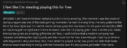 PS平台在12月13日当天上线了《战神:诸神黄昏》的首个DLC《英灵殿》,这次的DLC跟此前的两部正传作品截然不同,其中既保留了原有的战斗体验,又融入了roguelite元素。多达五种难度选择,还提升了游戏的挑战性。 圣莫妮卡工作室的总监Mihir Sheth在DLC上线当天就喊话玩家:“开发团队没有人能以最高难度通关游戏,我非常好奇玩家们最快什么时候发布最高难度通关的消息。”虽然这是句打趣的话,但无疑激起了大伙的好胜心,许多人都自主投入到了通关挑战之中。 而这个名为《英灵殿》的DLC,保持了《战神》系列一如既往的高品质。“经历了诸神黄昏之后,奎托斯进入了英灵神殿,在这里他将自己对精神与肉体的掌控力推向了极限。”这段深入的个人与反思之旅,也为roguelite元素提供了施展空间。 《英灵殿》的冒险旅途没有了儿子的陪伴,奎托斯像初代作品中那样独自作战。不过这一次的他少了满腔愤怒,更多是为了跟过往来个了断。对于老玩家来说,这次的冒险之旅有着许多怀旧元素。其中就包括当初的奥林匹斯之剑,以及被戏称为手电筒的赫利俄斯的头颅。 并且在最终的Boss战后,玩家还能看到年轻版的奎爷。在二周目中玩家甚至可以解锁新的形象,以初代的面貌进行游戏。 相信熟悉《战神》系列的玩家都能注意到,《英灵殿》DLC的封面构图跟原先都是一样的。 《英灵殿》DLC的高质量让人惊叹,流程长达20小时突出个量大管饱,但更重要的是这次的更新为完全免费的。 一位Reddit上的网友就表示“这款免费DLC让我仿佛回到了12岁在PS2上玩初代战神的日子。”评论区网友则认为,圣莫妮卡工作室明明可以收20—30美元的费用。 今年的TGA年度游戏展上,《赛博朋克2077》的DLC《往日之影》就凭借拿下了“最佳持续运营游戏”奖项。如果不是《英灵殿》DLC的发布时间在TGA之后,关于这个奖项的归属或将出现更多波折。 《战神:诸神黄昏》的故事讲到这里看似结束了,但圣塔莫尼卡工作室的资深作家 Orion Walker却给玩家们卖了个关子,表示“我们还有很多故事要讲”。未来大家可能看到更多DLC,又或是以洛基为主角的新内容。 那么大家对于《战神》系列游戏,又有怎样的评价呢? |