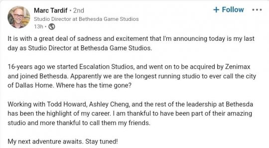 近日B社总监Marc Tardif在领英发文称已离开工作室。Tardif表示很感激曾是B社其中一员,更感激能与其他人成为朋友。他的新冒险即将开始。 Marc Tardif表示:“我怀着无比悲伤和激动的心情宣布,今天是我在Bethesda担任总监的最后一天。16年前我们创办了Escalation Studios,后来被Zenimax收购加入Bethesda。很显然我们是达拉斯市历史最悠久的工作室。时间都去哪了?” “与Todd Howard、Ashley Cheng和B社其他领导共事是我职业生涯的一大亮点。我很感激能成为这个令人惊叹工作室的一员,更感激能称他们为我的朋友。我的新冒险即将开始,敬请关注!” |