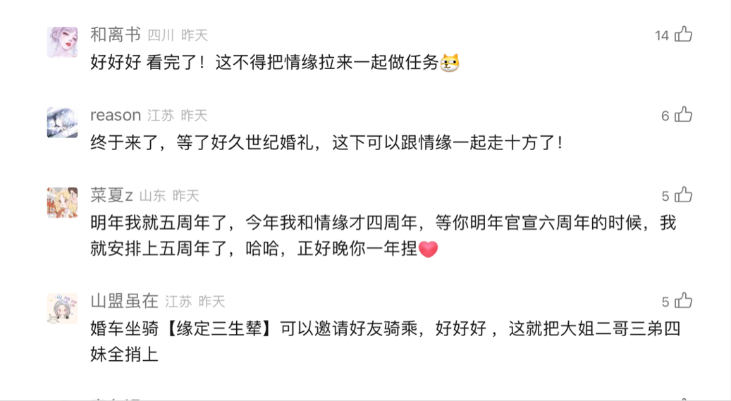 国内外不少游戏厂商,在制作游戏的同时还把搞副业的技能树点满了,像什么搞音乐搞出几张唱片专辑、发歌成瘾的拳头、靠卖玩具发家的任天堂、被网友戏称“被游戏耽搁的动漫公司”的米哈游......都在副业上发展的风生水起。 而要说到最会搞婚庆的,网易《逆水寒》排第二,那或许没有厂商能排第一。 就在这个年底,逆水寒上线了一个名为“全民婚礼纪”的玩法。活动中不输现实真实度的互动内容、妙趣横生的任务细节,都让人感受到了逆水寒搞婚庆堪比专业公司的设计水准,引得大量玩家热议:在游戏圈卷就算了,这是要不给婚庆公司活路的节奏? 从官方透露的消息来看,这也不算是玩家夸张。全民婚礼纪活动除了支持玩家自由DIY婚礼现场,比如定制个性请帖、照喜好布置场景,还加入了伴郎接亲、伴娘藏鞋整蛊、新人共舞等现实生活中的迎亲环节。流程可以说是有模有样,带来的沉浸感不亚于参加了一场真实婚礼。 最特别的是,婚礼纪活动还给了一大批有家室的逆水寒玩家“二婚”的机会。别误会,“二婚”指的并非是支持玩家移情别恋,相反,游戏中已经结婚的情缘们,可以借着婚礼纪举办一次“小金婚”,给老夫老妻间的爱情保保鲜。 而在游戏中携手走过五年的玩家,还能获得五周年专属限定称号。当顶着称号的情缘双方互相靠近时,就能在周围触发梦幻场景特效,牌面满满令人羡慕。 一边在搞专业婚庆的路上遥遥领先,承包玩家心目中的甜蜜婚礼,另一边,逆水寒还彻头彻尾的当起了爱情保安,推出名为“恋恋笔记”的情缘玩法手把手教玩家谈恋爱,助力有情人感情升温。任务内容也一个比一个齁甜,像什么和情缘一起抓999只萤火虫,脚踏白雪共赏海天一色,看完了只能说,逆水寒搞浪漫还是有几把刷子的。 单是任务含糖量超标还不够,恋恋笔记玩法的奖励也相当香,相当吸引人。玩家完成有生之年任务,都能获得全新婚车坐骑“缘定三生辇”,可以和爱侣、亲友共乘游街。四舍五入这就等于逆水寒给每对情缘随了一辆婚车的份子钱,也难怪一大批玩家坐不住了。有情缘的抓住情缘肝任务,没情缘的孤狼玩家疯狂CPDD。 其实从恋爱到婚礼的一条龙式服务,不难看出官方打破地域限制,促成玩家结缘的心意,可谓是有条件要给玩家发对象,没有条件创造条件也要给玩家发对象。在五周年婚礼纪活动浩大的气势下,贴吧超话处处可见秀恩爱的帖子,比如有的师徒变情缘,在无数张高铁票和机票中成功迈向人生下一步。有的要和对象来场刻骨铭心的世纪婚礼。 还有的晒出了现实婚礼和逆水寒婚礼的混剪视频—很多游戏亲友跨越千里,从五湖四海赶来见证这段宿命相逢,玩家称得上是爱情友情收获满满。或许正是因为在社交玩法上的这种用心,游戏上线五年间,才能有无数对逆水寒玩家从虚拟世界走到了现实中,结婚生子。 不过话又说回来,可能很多人都没想到,看过那么多场婚礼,最专业的居然出现在了网游中。逆水寒为情缘玩家们量身定制休闲玩法的诚意,算得上是业内独一份了。“五周年全民婚礼纪”除了见证玩家们在会呼吸的江湖相知相识相恋的过程,更多的,也是表明了《逆水寒》游戏制作者深耕玩法和画面表现力,期望给玩家带来超越真实的游戏体验的初心。 |
