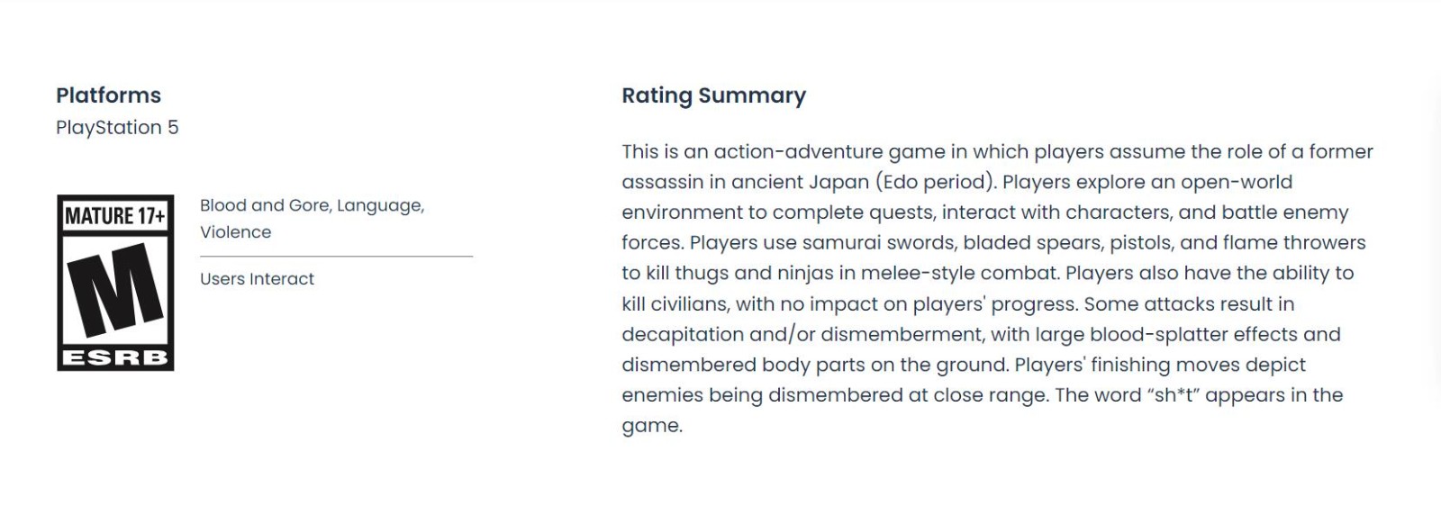 《浪人崛起》将于2024年3月22日登陆PS5。近日ESRB评级机构对《浪人崛起》进行了评级,该作被评为“M”成人级,包含血腥暴力等。