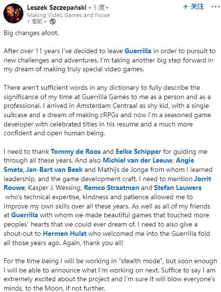 今日(12月28日),游骑兵工作室首席游戏程序师Leszek Szczepanski于12月20日宣布离职,Leszek Szczepanski已在游骑兵工作室工作了11年之久,曾参与射击游戏《杀戮地带:暗影坠落》、动作游戏《地平线:零之曙光》及其续作的工作。