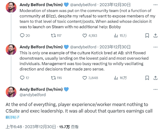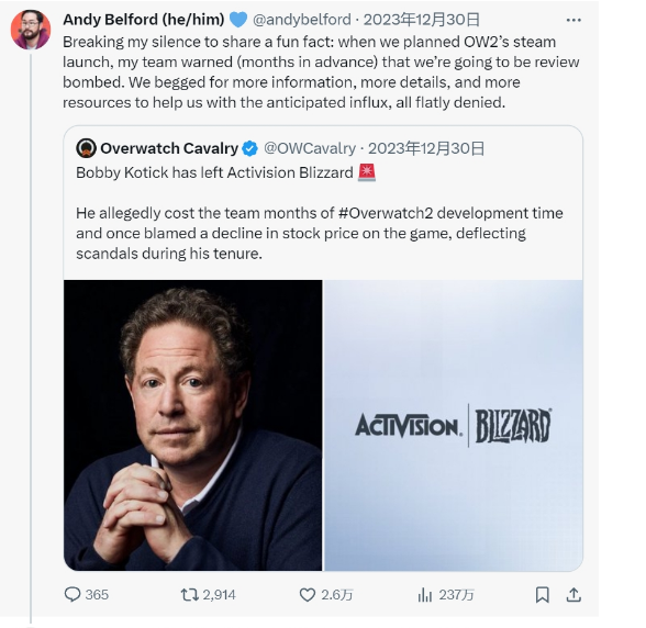 2023年八月,暴雪旗下的《守望先锋2》正式在Steam平台发布。搁在其他游戏身上,此举是拓宽了销售渠道,有利于游戏本身的销量增长。不过《守望先锋2》在上线后,却招致了大量玩家的差评。 “差评如潮”是Steam平台依照游戏的好评率而赋予的一个标签,但还不足以说明《守望先锋2》当时所遭遇的严峻形势。玩家们只需要知道,《守望先锋2》在短短几天内,就超越了《三国杀》登上了Steam差评榜榜首。 时隔四个月,原本这个话题的热度已过。可近来随着暴雪CEO考迪克的离职,一位暴雪员工却站了出来,将《守望先锋2》遭受差评的原因归咎于他的身上。这位暴雪员工表示:“高层只关心财务报告的高层完全不在乎玩家和员工的感受。” 2023年12月30日(上周五),为暴雪掌舵32年的考迪克正式离职。而今在暴雪的官网,你已经看不到关于考迪克的个人信息介绍了。至于此次对考迪克发难的人,则是暴雪的资深社群发展经理Andy Belford。他对当时的情况,进行了具体的描述。 据悉,当时暴雪决定在Steam发行时,社区的团队就已经预料到了海量差评的到来。可当社区团队要求上面给予更多资源倾斜和细节补充时,却都遭到了拒绝。彼时做出这项决策的人,正是CEO考迪克。 最终《守望先锋2》上线后取得的玩家反馈,如社区工作人员预料的一样,这也使得身为社区发展经理的Andy Belford得出了结论:“这只是考迪克给动视暴雪带来负面影响的一个例子,这种自上而下的错误决策经常让薪资最低的基层员工承受沉重的压力。” 而另一位前暴雪员工Jason Hall,在近期的直播中还谈到了暴雪特殊的裁员方式: “经理们对着门口站成半圈,从大门进来的员工被分流到左边或者右边的侧门,被领到右边的被裁员,走左边可以安全回到工位。不过搞笑的是,很多人其实习惯不走大门而是走另一边的小门,他们回到了工位又被经理找过来,悄悄地请了出去。” 《守望先锋2》的差评都是因为社区工作不到位导致吗?当然不是,但至少暴雪原本可以做得更好一些。而上述这些现任和前任暴雪员工们所吐槽的内容,在公司内部显然是存在的,甚至在未来的日子里,或许还会出现更多新的吐槽。 不过新年新气象,经历了被微软收购、对国服重开的探索以及考迪克离职后,暴雪正在尝试改变。至少在诸多未来选项中,暴雪有了更多可能。而最终也希望在崭新的2024年,能看到一个更令玩家们满意的暴雪吧。 那么大家对此又有什么想说的呢? |