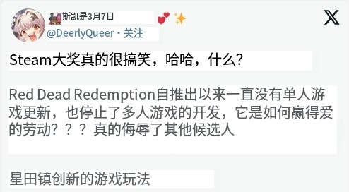 轻松惬意奖:《潜水员戴夫》 《博德之门3》在这次的玩家投票中不负众望,再度斩获了“年度最佳游戏”称号。紧随其后,《Labyrinthine》也收获了年度最佳VR游戏奖。只是今年的获奖名单中,却有四款游戏饱受争议。乃至于有人认为,这份投票结果被恶搞了。 R星的开放世界大作《荒野大镖客:救赎2》,获得了爱的付出奖。而爱的付出奖本身,对标TGA的奖项其实是“最佳持续运营游戏”的定位。可《荒野大镖客:救赎2》不论是本体还是线上模式,都已经停止了大更新,更别说像《赛博朋克2077》那样推出DLC。 不可否认这是一款优秀的游戏,但《荒野大镖客:救赎2》跟爱的付出奖的要求,确实挨不上边。“停更游戏”和“持续运营游戏”在某种层次上,其实是处于对立面的。因此Steam的评选结果,引发了不少玩家的非议。 B社多年磨一剑推出的太空冒险游戏《星空》,此番获得了最具创意玩法奖项。可是自这款游戏发布以来,玩法缺乏创新性正是玩家们给这款游戏打上的标签。当下,《星空》在Steam的好评率甚至都未能达到30%。 而在2022年年初风光一时,凭借哈利波特IP取得千万销量的《霍格沃兹之遗》,在本期的榜单上荣膺最佳Steam Dack游戏奖项。可是这款游戏在Steam Dack上的表现并不好,这主要集中在优化方面。 最后要提到的是最佳原声音轨游戏得主《最后生还者:重制版》,客观来说这款游戏的争议并没有上述三款游戏那么大,但《最后生还者:重制版》本质上是对2013年《最后生还者》的高清优化。当时这款游戏就获得过类似的奖项,此番再度获奖多少显得有些奇怪。 由于Steam年度大奖的评选都源自于玩家投票,所以不大可能存在“暗箱操作”的情况。最大的影响要素,恐怕还是因为作品本身的名气。如果你注意到这四个奖项的候选游戏名单就会发现,最终的获奖者都是热度最高的那款作品。 这次的评选结果告诉大家,完全由媒体网站评选的游戏或许不能服众,但这也未必代表着玩家票选的结果,就一定是合理的。因为如果按照这个标准,大体量的游戏天然就具有优势。 不知道大家在看完2023年Steam大奖的获奖名单后,又有什么想说的呢? |