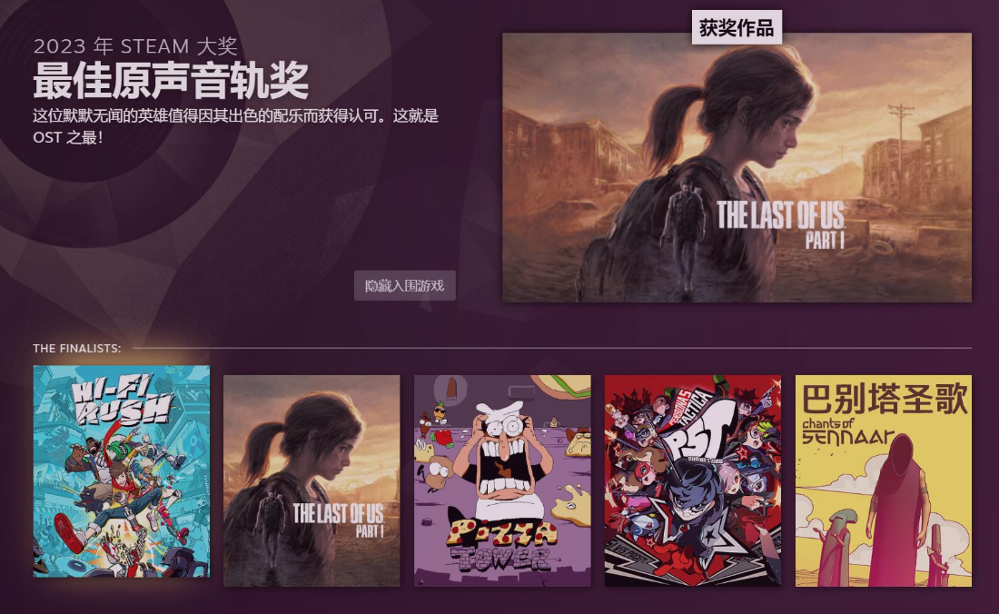 最佳Steam Deck游戏奖:《霍格沃茨之遗》 独乐乐不如众乐乐奖:《致命公司》 杰出视觉风格奖:《原子之心》 最具创意游戏玩法奖:《星空》 纵使手残仍大爱奖:《师父》 最佳原声音轨奖:《最后生还者》 杰出剧情游戏奖:《博德之门3》