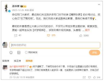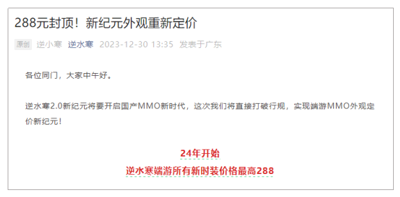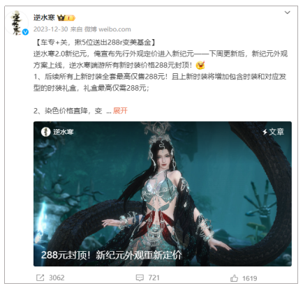 听劝,可谓是游戏厂商最好的医美之一。很多靠长线运营活得滋润的网游,往往是懂得尊重玩家意见,重视玩家诉求的。但因为玩家一个意见,直接耗资数百亿发福利的官方,说实话,在游戏圈可不多见,网易旗下的《逆水寒》就偏偏是一个。 前段时间,《逆水寒》出了一套东方太阳神主题的东君外观,耀眼华美的造型刚曝光就得到了大批外观党的追捧。但上架后很多端游玩家开始讨伐官方。 面对玩家的不满,素以听劝出名的《逆水寒》直接原地立正挨骂,并迅速给全体端游玩家发了一封诚恳的道歉信。道歉信中,官方在外观定价上给出的“滑跪”三连招,不仅获得了玩家的好感,还给一众友商卷懵了。 首先是《逆水寒》给所有购买了东君外观的玩家补偿了一张永久期限的时装半价券,玩家后续购买任意一套时装时,都可以白嫖到5折的福利优惠。 其次就是,为了更好地安抚玩家情绪,官方直接把元旦上线的2024新年主题时装【游龙昭新】降价了200元。时装及配套发型、耳饰打包以68元骨折价出售。500万玩家人手一套,那相当于《逆水寒》自掏腰包拨了10多亿来给玩家添新年头彩,可以说是十分大方。 尤其是这款龙年主题的外观端庄贵气,从材质细节和造型设计来看,整体都算得上是《逆水寒》中顶奢级别的时装,68元就能拿下,四舍五入等于白嫖了。 官方知错就改的态度,以及如此良心的补偿内容,都获得了《逆水寒》玩家如潮好评,不少外观党留言“肯听劝就是乖寒宝,价格降了大家也会多买多拍”。 其实就像玩家夸的那样,听劝的游戏才是更圈粉的。而为了把宠粉人设进行到底,逆水寒还在道歉信中透露,自己一定会在一周内给出时装定价的满意方案。 果不其然,几天前逆水寒放出了一记终极大招:逆水寒2.0版本1月18日上线后,时装定价最高288元封顶,MMO将迎来外观价格新纪元。某种意义上来说,这就等于是逆水寒开启了一项烧钱数百亿的补贴计划。颠覆行规的定价策略一出,第一时间震撼了整个游戏圈。 在逆水寒公布的“新纪元外观定价方案”中,2024年开始,游戏内的时装整体价格降低,未来所有的新时装价格都将非常亲民,最高售价不会超过288元。无论是赛事应援时装,赛季限定时装礼盒、还是商城高级时装都不例外。 同时低价时装也会上新得更频繁,譬如2月初就会有一套惊喜登场,价格非常白菜,只需要6元,这样的定价放在整个mmo游戏圈都是相当罕见的。 而针对价保问题,逆水寒表示,如果是赛季服时装价格低于正式服对应外观价格,正式服玩家就会得到等额折扣券的补偿奖励。 就拿这周上线赛季服的巴蛇主题时装【玄鳞枕骸】来说,正式服玩家当初拿下大概要四五百元,而这次上新赛季服后跳崖降价了50%左右,售价为288元。如果赛季服玩家用了补偿的半价卷,144元就能买一赠五,把时装、专属待机动作、蛇系妆容等“绝版”外观打包带走。换言之,正式服玩家也能白嫖到价值几百元的代金券。 这种动不动就是打骨折的定价操作,除了令友商瑟瑟发抖,对于全服玩家来说,也是一件值得拍手庆祝的事情。特别是,《逆水寒》不光“时装整体定价”放眼同类游戏中是最低水准,官方还把染色价格打了下来,比以前便宜了一半不说,后续还会通过多种渠道给玩家发放更多的珍稀染色道具,更大程度上实现了玩家的染色自由。 力度拉满的价格战方案刚一公布,就引起了许多玩家的强烈关注。大家纷纷调侃:这是不给友商留活路的节奏?还有玩家表示,东君时装补偿只是胜利的第一步,现在才是国游玩家真正的胜利。贴吧,超话等平台上都是玩家热情讨论的身影,几乎每一位玩家都对2.0的定价新纪元充满期待。 总的来说,《逆水寒》之所以能够备受百万玩家喜爱,优质的游戏内容,以及良心到事事有回应的运营方式都起到了不可或缺的作用。1月18日开启的新纪元版本,对于新老玩家而言更是一个福利强到离谱的版本。要是有朋友感兴趣,现在可以说是回来玩《逆水寒》的最佳时机,可不要错过啦~ |