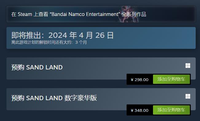 鸟山明同名漫画改编游戏《沙漠大冒险》Steam预购现已正式开启,国区标准版售价298元,豪华版售价348元,该作将于2024年4月26日发售,登陆PS5、PS4、Xbox Series X|S和Steam,支持中文。