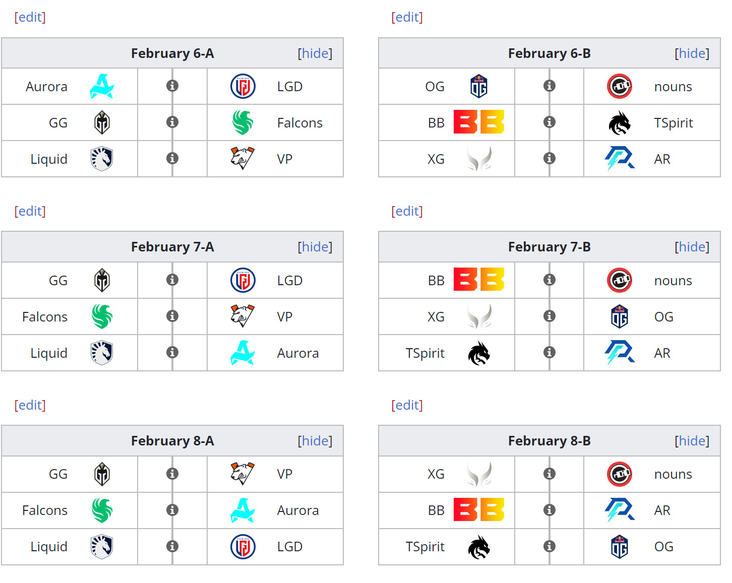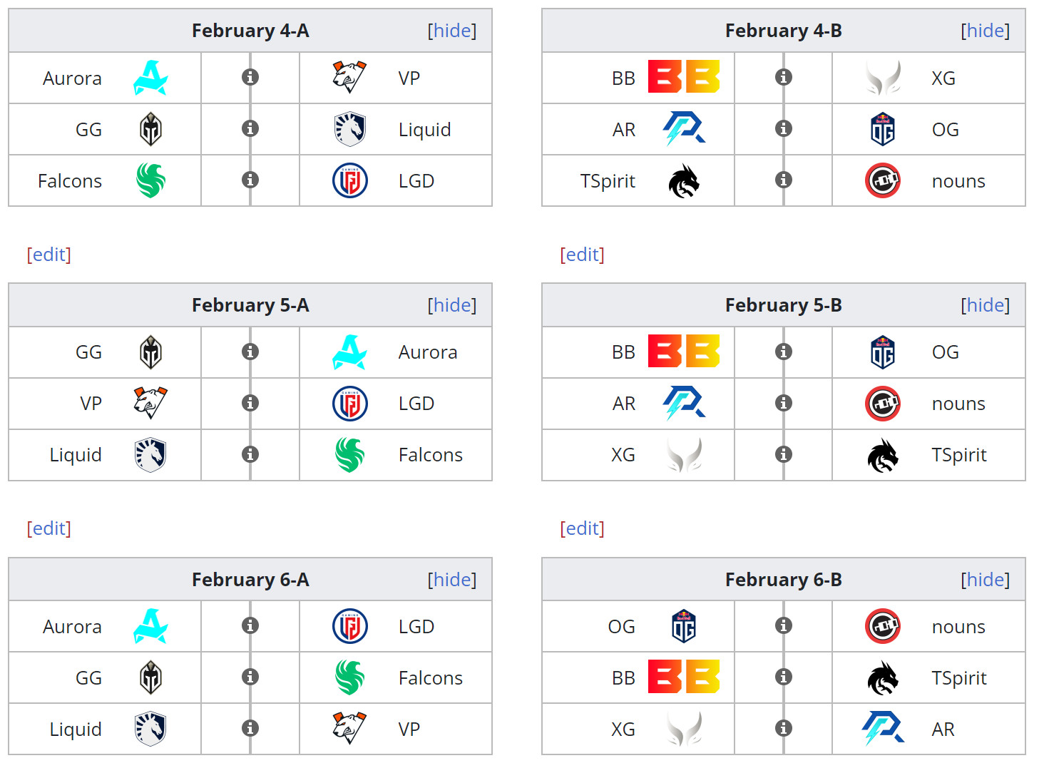 《DOTA2》迪拜别墅杯即将于2月4日开打,今日举办方公布了12支参赛队伍的分组情况。中国队AR和XG分在了同一组B组,和BB、OG、Team Spirit一起,而LGD独自在A组,A组的其他队伍实力偏弱一些。 A组: Aurora GG LGD Team Falcons 液体 VP B组: AR BB Nouns OG Team Spirit XG 首轮比赛将于2月4日进行,A组LGD将对阵Falcons,而AR将对阵状态同样火热的OG战队,XG对阵BB。 小组赛赛制:12支战队分成2个小组进行BO2循环赛,小组前4晋级淘汰赛,小组5,6名被淘汰 淘汰赛赛制:双败淘汰赛,除了总决赛为BO5,其余为BO3 |