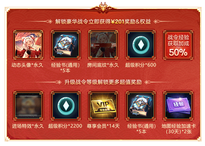 2024龙年将至,与K妹共庆佳节,一起舞动新春。购买豪华战令,超过500%的超值奖励等你来领!包括专属动态头像、进场特效、经验书、海量超级积分等!让你在平台拥有更加酷炫的表现!全新挑战、专属任务等你来完成!赶快行动,和K妹一起领略奇妙的世界吧! KK战令S4活动介绍 战令信息 KK战令S4将在北京时间2024年1月22日12:00-2024年2月18日23:59进行,在平台活动中心板块,可以通过完成活动页面中的战令日常任务和周常任务,获取相应的经验值并提升战令等级、领取奖励。 战令奖励 此次活动的战令奖励分为普通战令奖励和豪华战令奖励。其中普通战令奖励在达到相应的战令等级后即可领取,而豪华战令奖励需要通过购买并解锁豪华KK战令后领取。 提升普通战令等级可免费获得:KK战令活动专属称号、300超级积分、地图道具自选礼盒和海量金币奖励等。 解锁豪华战令立得KK战令活动专属动态头像、房间底纹、经验书(通用)*5本和600超级积分。随着豪华战令等级提升还将获得更多额外奖励:KK战令活动专属进场特效、经验书(通用)、地图经验加速卡(30天)、2200超级积分和更多奖励! 豪华战令专属特权 -完成日常任务或周常任务获得战令经验值时可额外获得50%加成 -可通过每日祈愿获得额外的战令经验 最后,K妹恭祝大家新春快乐! |