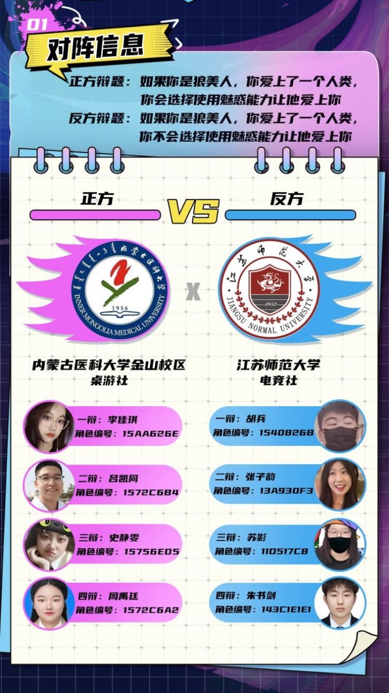 思辨至上,谁“语”争锋!2023狼人杀高校辩论赛在为期三周的激烈角逐后,顺利结束。最终来自内蒙古医科大学金山校区的辩手们,凭借稳健的表现及卓越的团队协作,拿下了冠军,彰显了自身扎实的实力与不凡的风采。 【高校辩论赛介绍】 狼人杀高校辩论赛是来自全国各地的高校学子,以4v4团队形式在狼人杀官方游戏内派对房展开的激烈辩论赛,本次比赛特邀南京传媒学院、江苏师范大学、浙江广厦建设职业技术大学、四川水利职业技术学院、武汉体育学院、内蒙古医科大学金山校区、东北农业大学以及辽宁石油化工大学八所大学的辩手。他们以独特的视角、缜密的逻辑和出色的表达能力,为我们呈现了一场场精彩绝伦的逻辑之争。 【冠军战队诞生】 经过了三周的激烈对决,内蒙古医科大学桌游社的辩手们成功拿下冠军,在最后一轮“如果你是狼美人,你爱上了一个人类,你会选择使用魅惑能力让他和你在一起吗?”的辩题中,他们作为正方代表与对手展开了激烈辩驳。 一辨选手李佳琪用精彩的观点率先开篇,为己方争夺到了有利开局,随后二三辩选手发挥的同样稳定,四辩选手周禹廷在最后做出了完整的总结发言,让他们顺利拿下胜利。在赛后他们接受采访时表示,很喜欢这种与现实生活有关的辩题,二辩吕凯同认为狼美人其实是现实生活中很多人的心理映射,“我们一直在追逐着什么,但是,也请不要忘了最初对于爱的本心。” 狼人杀高校辩论赛不仅锻炼了学子们的口才和思维能力,也让我们看到了青年学子的才华、激情和担当。对于学子们来说,这是一次思想的碰撞,一次智慧的盛宴,更是一次青春的狂欢。 感谢每一位参与比赛的辩手,用才华与努力,呈现出了一场场精彩绝伦的比赛,让我们共同期待下一届辩论赛的到来,继续见证更多才华横溢的辩手们的辉煌时刻! |