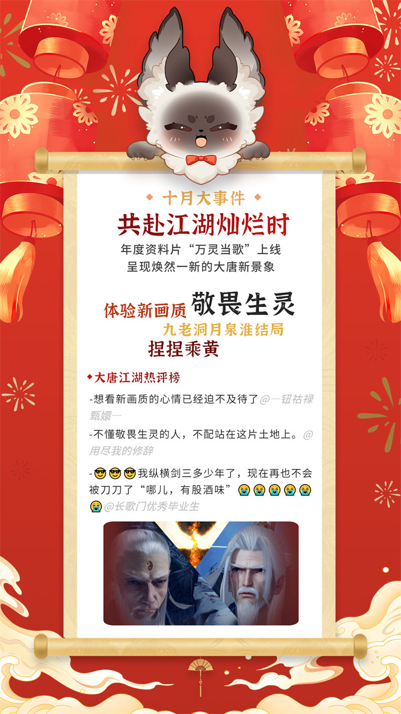 看完年度大事记,不知道侠士们是否身临其境呢?时光荏苒,2023年很开心身边有众侠士相伴,前行路上从不孤单。驻足回望,这一年里大唐江湖出现了许多新面孔,我们也迎来了许多重要转折。大唐江湖的2024年仍充满许多新鲜事,无论是全区服支持点月卡,或是开启跨服大世界,亦或是移动端无界畅玩,都等待你我共同游历。此去江湖,与君待续!