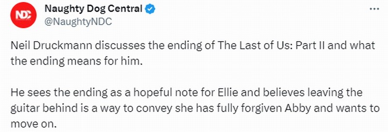 《最后的生还者2》已发售很久,但有玩家对结尾处艾莉留下乔尔的吉他有些看法。有人认为艾莉留下乔尔的吉他,表明她已经原谅了艾比并想继续前进。尼尔表示该想法在某种程度上是对的,取决于玩家自己的想法,这也是人性的复杂之处。