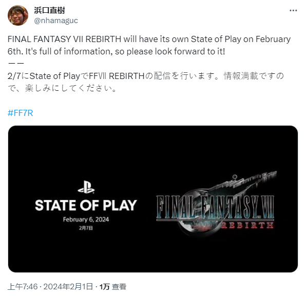 而《最终幻想7:重生》的游戏总监滨口直树在其个人推特账号上发文表示,《最终幻想7:重生》的全新情报将于2月6日(或7日,由时差和当地时间决定)举行的State of Play上公开。并且他还表示此次发布会将“信息量十足,敬请期待”。