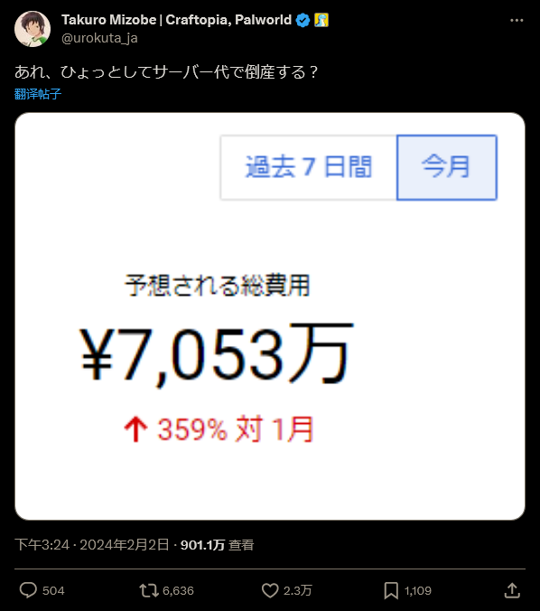 《幻兽帕鲁》2月服务器费用7千万日元 CEO:要破产了