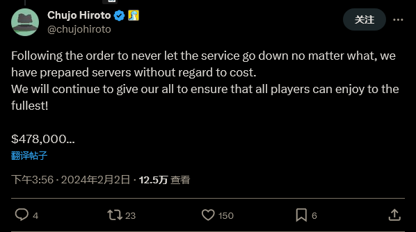 《幻兽帕鲁》的爆火对于开发商来说也有着不小的代价——开发商 Pocketpair 首席执行官沟部拓郎最近发布推文惊讶的意识到,自己可能会因为服务器运营费用而破产,因为 2 月预计的服务器服务费高达 7053 万日元(约合 47.8 万美元/338.5 万元人民币)。 他开玩笑的说道:“等等,也许我们会因为服务器费用而破产?” 此前,开发商曾公布数据,表示游戏在 Steam 上售出了约 1200 万份,总收入约为 3.6 亿美元(以每份 30 美元计算,当然游戏在低价区更便宜)。即便以 30% 的 Steam 抽成费用计算,公司依然有 2.52 亿元盈余。这还没有计算游戏登陆 Xbox 平台和 Game Pass 获得的收入。 《幻兽帕鲁》的首席网络工程师中条博斗在对自家老板的帖子中回复道:“遵循着无论如何都不让服务器终端的命令,我们不考虑成本的准备了服务器。我们将继续尽全力确保所有玩家都能充分享受游戏!47.8 万美元……” 另一点值得担忧的是,《幻兽帕鲁》不可能每个月都售出 1200 万份,而且游戏并非是实施服务型游戏获订阅制网络游戏,游戏内也不包含任何微交易。仅服务器就需要 47.8 万美元的月费,还没考虑到公司的运营成本……这显然是一笔不小的开支。 虽然未来玩家数量必然会逐渐减少,也会降低服务器运营成本,但是 Pocketpair 还计划未来增加官方服务器的联机人数限制。目前,如果玩家想要体验 4 人以上的联机体验,需要自己建立服务器,最高支持 32 人联机。 |