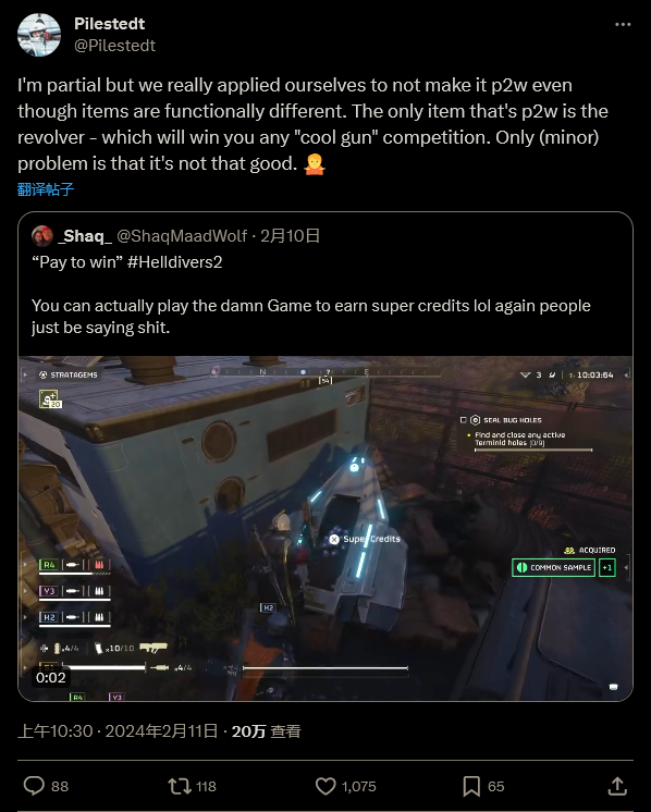 《绝地潜兵2》在推出后因为作为一款 PvE 游戏依然存在内购而备受批评。在推特上,游戏的创意总监 Johan Pilestedt 回应了这一问题,表示团队“真的竭尽全力,不让游戏成为付费变强(Pay-to-win/P2W)”。 他在推文中表示,《绝地潜兵2》中的高级版战争债券(类似通行证)仅提供“功能不同”的装备和武器。他开玩笑道:“唯一的 P2W 物品是左轮手枪,它会让你在任何比谁的枪更酷的比赛中获胜。”然而,这把武器并没有比正常解锁的武器强上一星半点(根据小编测试甚至不如原版可以解锁的冲锋枪)。 游戏包含普通和高级版战争债券,高级版需要花费 1000 点“付费”代币来解锁,或是购买游戏豪华版解锁。普通版游戏玩家可以通过花费 90 元升级至豪华版,不过豪华版还包括一些额外内容。高级版债券大多数是外观物品,不过依然包括一些武器:一把左轮、一把突击步枪,一把霰弹枪可一把爆炸武器。所有武器均是普通版可正常解锁武器的变体,而且经过测试他们更多的是功能性不同,强度甚至不如原版武器。 即便玩家购买了高级版战争债券,这些道具依然需要玩家通过完成任务获得的游戏内奖章解锁。 另一点需要说明的是,游戏内可以通过内购获得的“付费”高级货币也是可以通过在关卡中搜寻一些资源点获得。在普通版债券中,玩家也可以通过解锁获得高级货币,用于解锁高级版债券。但是让小编略感不满的是,高级债券价格为 1000 点,而在普通债券中仅能获得 750 点高级货币,而且游戏还有轮换商店,售卖一些盔甲,也仅可以通过高级货币购买。这些盔甲并没有强度上的区别,仅仅是外观不同。但这依然让人略感不满。 Pilestedt 承诺,游戏永远不会强迫任何玩家参与游戏中的内购:“‘游戏必须赢得内购的权利’——我真的相信这一点,如果人们想支持这个游戏,他们可以选择这么做,但我们永远不会强迫任何人付钱。” 虽然游戏中的内购确实并非强制性的,但是这已经是一款售价 198 元的游戏,而且它目前还有很多问题,包括服务器连接错误(据官方称服务器目前仅支持 36 万人同时在线)、匹配问题和优化问题。游戏推出时 Steam 上获得了褒贬不一的评价,不过目前已逐渐回暖,变为“多半好评”。虽然直接加入好友游戏没有问题,但是频繁的崩溃、掉线依然没有得到完全解决。 |