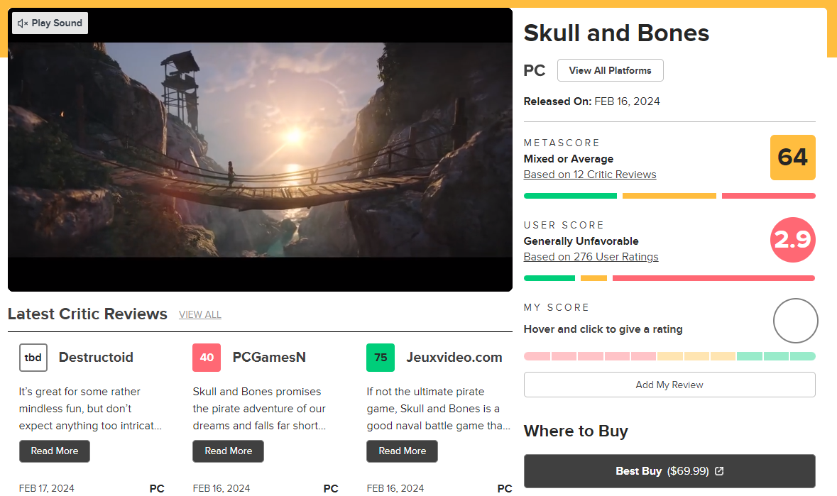 育碧“酝酿”多年的多人海战角色扮演游戏《碧海黑帆》,终于在2月16日正式推出。虽然育碧宣称这是一款“4A级”的在线服务游戏,但玩家对“4A级”的说法似乎不太认可。 知名评分网站Metacritic上,《碧海黑帆》获得了64分(满分100分)的总体评分,但用户评分仅为2.9分(满分10分),为M站自2024年以来所评分的游戏中,按用户评分排名的最后一名。 《碧海黑帆》的差评抱怨主要集中在其“平淡无奇”的游戏玩法、“设计糟糕”的终局内容上。还有玩家指责它是“无聊”的,甚至有不少玩家将其与《盗贼之海》及《刺客信条:黑旗》进行了不利的比较,认为《碧海黑帆》不过是“一款降级的《刺客信条》游戏”。 |