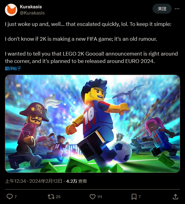 根据消息人士 Kurakasis 在推特上此前透露称,一款由 2K Games 开发的乐高足球游戏《Lego 2K Goooal!》将于 2024 年欧洲杯期间正式推出。 日前,他又发布新消息称,游戏将于 3 月正式公布,并将于 5 月或 6 月推出。今年的欧洲杯将于 6 月 14 日开始举办,持续至 7 月 14 日。 他还提醒称,这款游戏在发售前已经被推迟过一次,因此很有可能再次跳票。 《Lego 2K Goooal!》被部分称为“2K口风最送的秘密”,因为游戏于去年 11 月就被发现意外上架了 PlayStation 商店。至今 2K 仍未正式确认该游戏。游戏的封面图也是去年 11 月时通过 PS 商店泄露的。当时泄漏的消息称,游戏支持单人和多人游戏,最多支持 4 人联机。 此前还有传闻称,在与 EA 分手后,FIFA 或将寻求 2K 制作后续的《FIFA》系列游戏。 |