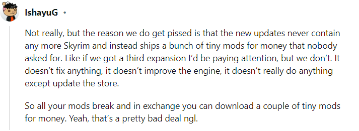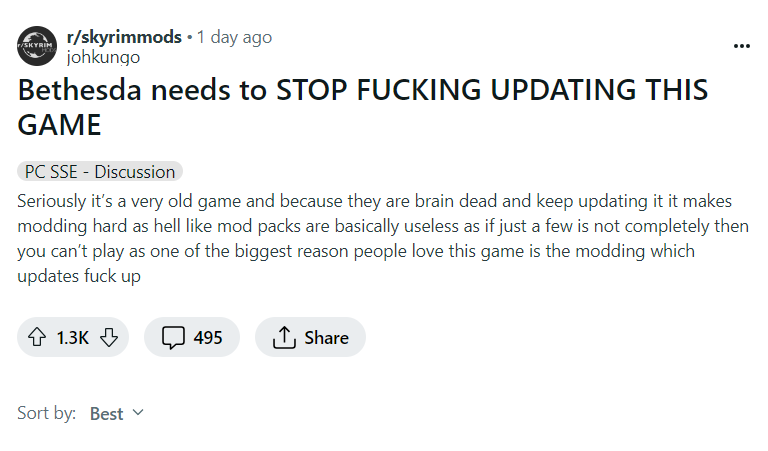 虽然贝塞斯达的开放世界科幻RPG游戏《星空》并未收获想象中的成功,但《上古卷轴5:天际》仍旧是许多玩家爱不释手的佳作。 B社自然也明白《上古卷轴5:天际》的重要性,因此在游戏发行的十多年后,依旧不定时的推送更新,在过去的几个月中就发布了两次更新。 不过玩家们似乎对B社的“勤劳”并不感激,甚至为此感到愤怒。 近日有名为“johkungo”玩家在国外论坛reddit上发帖表示:“贝塞斯达需要TMD停止更新这个游戏。”并且他认为B社这么做是因为他们“脑残(brain dead)”,只因为每次更新发布就会导致玩家的MOD无法使用,更新补丁完全是在帮倒忙。 考虑到“老滚5”至今还有如此高的热度,的确在很大程度上依赖玩家的MOD支持,因此有玩家认为B社的勤快不过是“无利不早起”。 Reddit用户“IshayuG”则指出,最近的一些更新其实与《天际》的游戏内容并不相关,而是对商店部分进行了更新,这不得不让人怀疑B社还在试图将付费模组商店带回游戏。 |