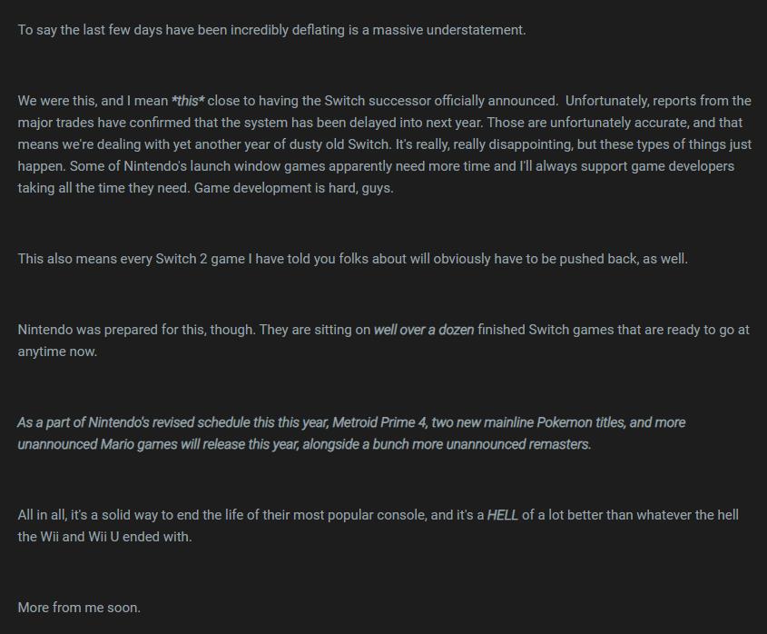 此前有大量媒体报道称任天堂Switch 2已被内部推迟到了2025年第一季度,知名任天堂爆料人Zippo近日也发文确定了这个消息,并且还表示因为Switch 2被推迟,所以Switch今年的游戏阵容有所变化,任天堂目前拥有数十款已完成的Switch游戏,随时可以上线。