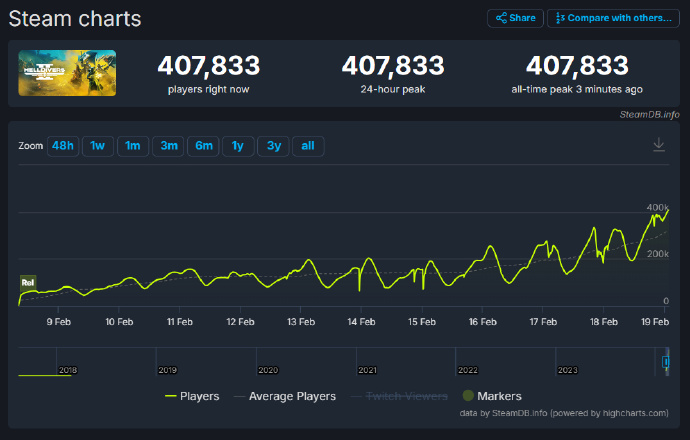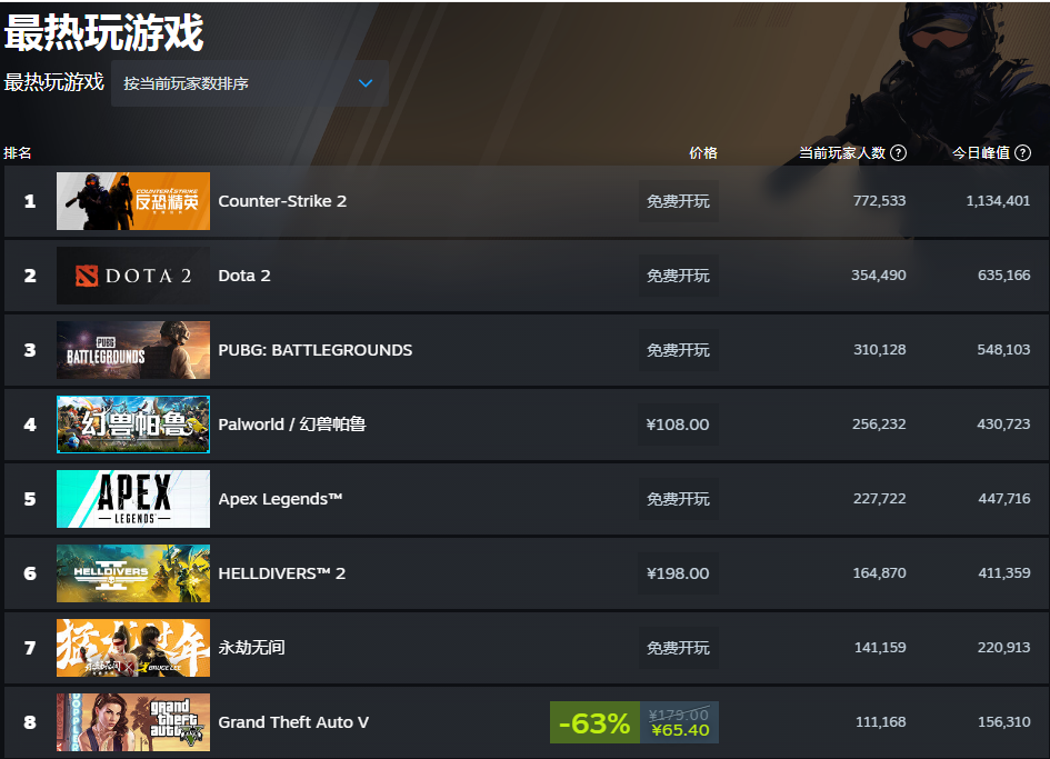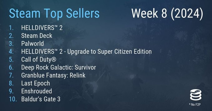 春节期间的Steam周销榜,因为大批玩家的涌入而出现了许多新变化。原以为可以再接再厉,挑战《PUBG》历史地位的《幻兽帕鲁》,在新游的冲击下离开了榜首。当然,榜单上也有许多老面孔依然坚挺。 2024年第8周Steam周销榜TOP10: 1. 《地狱潜兵2》 2. Steam Deck 3. 《幻兽帕鲁》 4. 《绝地潜兵2》超级公民版升级包 5. 《使命召唤》 6. 《深岩银河:幸存者》 7. 《碧蓝幻想:Relink》 8. 《最后纪元》 9. 《雾锁王国》 《博德之门3》 《绝地潜兵2》(占据着第一和第四名)是龙年春节过后Steam最炙手可热的游戏,过去的两周不仅蝉联了销冠的名号,在玩家在线人数方面,也是当下所有游戏中排名第六、付费游戏中第二高的作品。在同类型游戏中,亦是最能打的。 由于玩家人数太多,原本只能承载45万玩家的服务器不堪重负。没有办法,官方采纳了玩家意见,准备上线“自动踢人”功能。这么做的目的,是为了防止一些玩家为避免排队而将游戏挂起来去休息。而主动赶人的做法,也足以说明《绝地潜兵2》当下之火爆。 《幻兽帕鲁》排名第三,虽然当下的平均在线人数依然能够稳定在数十万,但巅峰已过,未来想要再冲一波纪录基本已经不可能了。不过对于开发商来说,能创造千万级别的销量已经是个奇迹了,接下来的持续更新并保障长期运营才是重中之重。 《使命召唤》排名第五,作为动视暴雪当下吸金能力最强的游戏IP,它同时也是服务型游戏的标杆,自发售以来常居Steam周销榜TOP10。因此咱们还是将目光,放在《深岩银河:幸存者》、《碧蓝幻想:Relink》以及《最后纪元》这三款作品身上吧。 这三款游戏分别代表着肉鸽休闲动作游戏、二次元冒险游戏以及RPG游戏,它们来自于不同的厂商,游戏风格、体量也各异。但从严格意义上来说,都不是那种3A级别的大作。下期榜单是否还能看到它们,就是个未知数了。 排在最后的两款游戏,分别是生存建造游戏《雾锁王国》以及TGA年度最佳游戏《博德之门3》。 《雾锁王国》是与《幻兽帕鲁》同期的作品,凭借超高的建造自由度,它在与2024年迄今为止的最强爆款的竞争中生存了下来,并且获得了百万级的销量。但也因为体量问题,热度下降还是比较明显的,很有可能跌出下期的榜单。 至于《博德之门3》,已经是本期榜单上最持久的游戏了。自上线以来,鲜有跌出过Steam周销榜前十。不过大半年时间过去,强如《博德之门3》也从榜首变成了前十守门员。或许很快就会有游戏,从它手中接棒吧。 那么大家在看完本期榜单后,又是否找到了自己正在体验的游戏呢? |