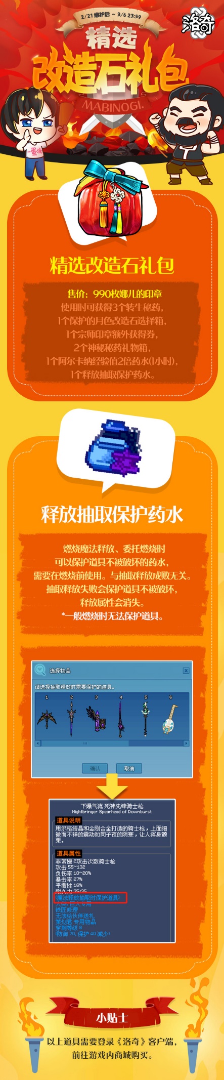 传统节日元宵节来临之际,有一位奇怪的书生来到了爱琳大陆,他说元宵节期间,想给我们介绍一下他家乡的传统游戏。 卡普港口正在举办节日!让我们一起吹气球,许愿,享受传统游戏吧! 孔明灯庆典 灯塔附近有很多前来放孔明灯的游客。当你狩猎怪物时,有机会获得孔明灯制作工具。发挥你的手艺,制作3个孔明灯,作为礼物送给灯塔周围的游客 如果有10人或以上聚集在灯塔附近,就会举行庆典活动。如果你也放飞孔明灯,会获得战斗经验药水(30分钟) 玩跷跷板很有趣! 你可以在书生乔的商店购买跷跷板组合工具,然后和你的朋友一起玩跷跷板吧! 听说如果跳的很高,会发生一些神奇的事情! 活动参与奖励 【精选改造石礼包】 精选改造石礼包限时促销,武器升级不用愁,有需要小伙伴不要错过了喔~ 元宵节专属活动与改造石礼包限时上线!月兔芙洛拉宠物等你来带回家喔~ |