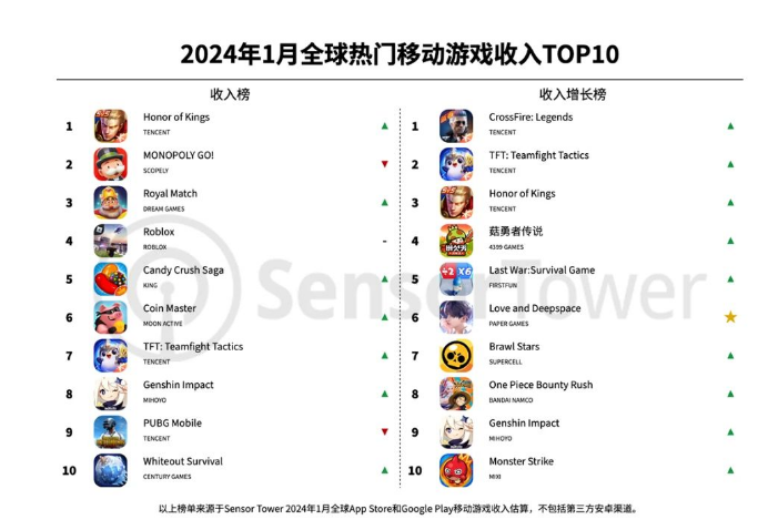2024年的第一个月,全球手游玩家在App Store和Google Play付费数据达到了65亿美元。而在全新的一年里,处于头部地位的10款游戏名单也产生了剧烈变化。新老面孔的交替,展现着手游市场的活力。在这之中,国产游戏又有着统治级的表现。 日前,Sensor Tower商店公布了最新的情报数据,具体的排名如下—— 《王者荣耀》 腾讯 MOBA游戏 《Monopoly GO!》 Hasbro 休闲游戏 《皇室战争》 Supercell 即使战略游戏 《罗布乐思》Gamefam Studios 休闲益智游戏 《糖果传奇》 King 三消休闲游戏 《金币大师》 Moon Active 三消休闲游戏 《金铲铲之战》 腾讯 自走棋游戏 《原神》 米哈游 二次元开放世界冒险游戏 《PUBGM》 腾讯 大逃杀游戏 《寒霜启示录》 点点互动 SLG游戏 2024年首月,腾讯旗下的王牌手游《王者荣耀》吸金2.33亿美元,在与《Monopoly GO!》的竞争中获胜,重新返回了榜首位置。当然,这与1月份各种皮肤返场活动密不可分。这款游戏自上线以来始终保持着火热的势头,长期居于手游收入榜第一名。 《王者荣耀》国内市场的收入份额高达九成以上,但腾讯不断在追求着走向全球化。近期,《王者荣耀》国际服已在东欧、中东、北非、中亚和南亚地区上线,相信未来的营收数据还有望更进一步。 脱胎于《大富翁》玩法的《Monopoly GO!》,进入2024年后表现依旧强势。作为近五年来为数不多超越过《王者荣耀》的作品,这款手游主打一个通吃全年龄段玩家。本作在强调社交性之余,还非常注重玩法的打磨,长期留在TOP 10榜单上并非难事。 排名榜单第三——第六名的四款游戏,都是熟面孔了。在全球范围内,休闲类游戏凭借海量的玩家支持总能取得不错的成绩。细分之下,《皇室战争》、《罗布乐思》跟《糖果传奇》和《金币大师》之间又有着各自的基本盘。但无论排名怎么变,都不会掉出第一梯队。 1月份的手游收入数据,真正令人惊讶的其实是几款国产游戏的出场。如果说《PUBGM》和《原神》只是排名下降的话,《金铲铲之战》与《寒霜启示录》的上榜就是意外之喜了。 《金铲铲之战》在春节前夕的各种福利活动和内容更新,为游戏收入的提升提供了助力,环比增长达到了148%。来自于国内开发商点点互动的《寒霜启示录》,通过对“冰雪生存题材”的尝试,成为了一匹黑马。 官方买量投放方面的成功是一方面,但也不能忽视《寒霜启示录》的3D二次元画风,以及结合了休闲放置、生存建造玩法对玩家们的吸引力。当下,这款游戏已经高居中国手游出海收入榜榜首。 2024年1月,全球手游收入榜Top 10中,国产游戏占据着一半席位。虽然排名比较分散,但影响力已经不容忽视。而未来也期待能有更多新作品,出现在全球手游收入榜的前列吧。 不知道大家在1月份,又为哪些游戏贡献过数据呢? |