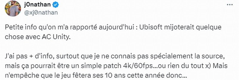 近日知名育碧舅舅党油管主j0nathan发推文称,他听到一个小道消息:育碧似乎将推出《刺客信条:大革命》复刻版。他对此了解不多,因为不知道其消息来源。