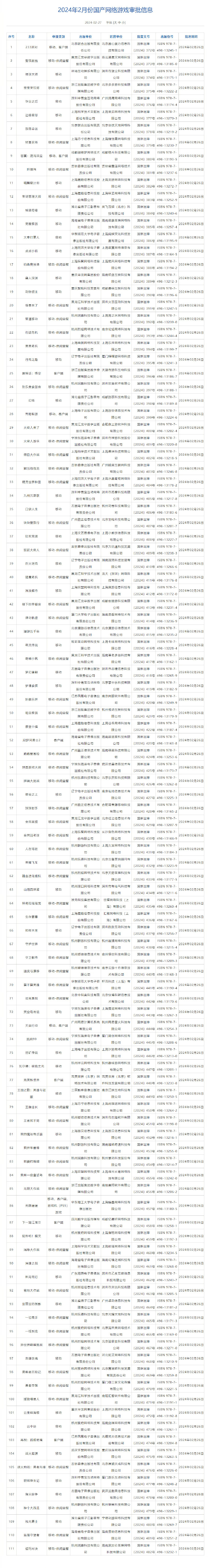 国产网络游戏的环境,从去年年底开始迅速回暖,国家资讯出版署已经连续三个月发布国产网络游戏审批信息。继去年12月的105款、今年1月的115款之后,今日公布的2024年2月份国产网络游戏审批信息中,又审批通过了111款国产网络游戏。 本期的国产网络游戏版号过审的名单中,依然是以移动端的作品为主。111款游戏中,101款为纯粹的移动端游戏。包含客户端玩法的游戏有10款,但仅登陆PC端的游戏为5款。具体名单如下—— 移动/PC平台:《223派对》、《苍翼:混沌效应》、《荒野起源》、《天启行动》、《无限暖暖》(多平台游戏) PC平台:《黑神话:悟空》、《尼罗河勇士2》、《完美新世界》、《下一站江湖II》、《再战:孤舰绝境》 都说“缺什么补什么”,相较于移动端作品,玩家们普遍对本期国产网络游戏版号过审名单中的PC平台游戏更加感兴趣。而在五款仅登陆PC平台的游戏中,由游戏科学开发的《黑神话:悟空》又是最惹人瞩目的那一个。 2020年的8月20日,《黑神话:悟空》凭借13分钟的实机演示视频引爆了网络。游戏科学依靠这条视频,开启了中国玩家对国产3A游戏的新期待。之后几年的8月20日,《黑神话:悟空》都能带来新的重量级消息,去年更是开放了首次线下试玩。 当前,《黑神话:悟空》在Steam愿望单上依然是最被期待的作品,并且已经确认会于今年8月20日正式发布。此番版号过审,算是在程序上增加了一道保险,而后续也期待它能取得好的市场表现和玩家口碑吧。 而除了移动端和PC端的新IP以外,本期的过审名单中还有《永劫无间》手游这样的国风动作游戏。此前《永劫无间》的端游版本,就已经在Steam上取得过巨大成功。手游化之后,相信它还能获得更广大的玩家受众。 以下为2024年2月份国产网络游戏完整审批名单: