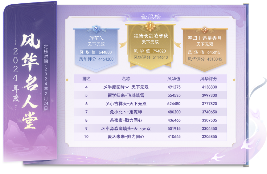 碧玉妆成一树高,万条垂下绿丝绦。?随着凛冬的逐渐离去,春天的脚步也愈发靠近,正是少侠们外出品赏春光的好时机~《天下3》全新春日主题外观直售礼盒靓丽来袭,只需6毛,便能助你在大好春光中成为C位! 与此同时,轩辕英魂洗炼节即将上线,少侠完成相关活动,即可免费获得珍稀的洗炼材料!更有全新奇遇【春山难上】等你来探索……接下来一起看看本周的更新要点内容吧~ 全新春日外观、奇遇来袭,0元购饰件待你解锁! 即日更新后-3月13日更新前,商城限时上架直售外观礼盒【禁】差不多行了礼盒、【禁】这能说吗礼盒,活动期间限时折扣,仅需6元宝,且可使用外观抵扣券全额抵扣,活动结束后将恢复原价88元宝。限时活动进行中,各位少侠欲购从速。同时,少侠们还可以前往九鼎城西侧青崖后山的廊桥上,对NPC杨风渊使用大荒美拍,触发奇遇【春山难上】。不需要用尽所有力气,在这大荒你永远是世界的中心! 此外,3月商城-装饰形象外观即将上新:2月28日饰件【鸢起春风】上架,定价12元宝;3月6日上架饰件【金萤夜鹤】,定价15元宝;3月13日上架饰件【碧空龙吟佩】,定价8元宝。三款全新饰件均为非限时直售外观,可使用外观抵扣券全额抵扣兑换!此外,3月还有神秘活动等着少侠,大家敬请期待吧~ 风华名人堂定榜,定制奖励后续发放 本年度风华名人堂已定榜,恭喜来自天下无双的独倚长剑凌寒秋少侠,以794020风华值和5114640风华评分,拿下本年度风华名人堂榜首。 风华钦定相关的定制奖励,开发组正在与少侠沟通中,将于后续发放。以下是本次风华名人堂全服榜前十的信息,再次祝贺上榜的少侠! 轩辕英魂洗炼节,助你打造神兵利器 3月1日8点-3月8日0点,活动时间内,少侠参与洗炼节的活动任务,可获得道具赤晶石、炽金锭,可使用其道具兑换轩辕英魂洗炼相关的养成材料。两种道具均为限时道具,请少侠在道具过期之前完成兑换。 开发组将根据少侠当前的轩辕英魂数据,计算洗炼系统评分,少侠确认开启后,以当前的评分作为初始评分依据,进行洗炼评分分级,并参与到洗炼评分增量榜活动中。少侠的初始洗炼评分越高,洗炼评级就越高,参与洗炼节的任务奖励也越丰厚哦~ 定乾坤·双神之战结束,阵营相关玩法关闭 本周更新后,定乾坤服务器双神之战活动将关闭,阵营相关玩法也会随着活动关闭,阵营信息将不再显示,阵营商店同样会关闭,需要兑换道具的少侠请注意时间。同时,阵营模式将不再可用,势力战、城战均不再自动报名。开发组表示后续将会针对本次玩法数据,进行调整和优化,后续会以更好的方式,再次与各位少侠见面。 主题服势力驻地图腾生效 本周更新后,天下3主题服的势力界面的势力建筑界面新增图腾阵列入口,主题服的天下联赛·图腾阵列系统将同步生效至势力驻地场景。值得注意的是,仅对特定类型战场生效的图腾在势力驻地中将不会生效。势力驻地场景包括所有势力的驻地。 世界相关,体验优化 开发组修复了曲水流觞活动奖励道具使用灵犀玉转换后无法正确上架藏宝阁的问题;将上架2月22-27日的补签卡,春节签到将于3月6日关闭,请少侠及时完成补签并领取奖励;对于无法上架藏宝阁的装备,会在道具tips上增加禁藏宝阁寄售标识。通过斗转星移转移的奇珍饰件重新穿戴下即可激活对应事迹;钦定计划结束,狮舞春宴时装已变为可升级永久。 以上便是本周更新后的要点内容。6元宝全新春日外观,邀你一起赏大荒春色,C位出道。致力于打造神兵利器的少侠可别忘了3月1日开启的轩辕英魂洗炼节,来参与活动赢丰厚奖励!若想了解更多详情,少侠可前往天下3官网查看完整更新公告哦~ |