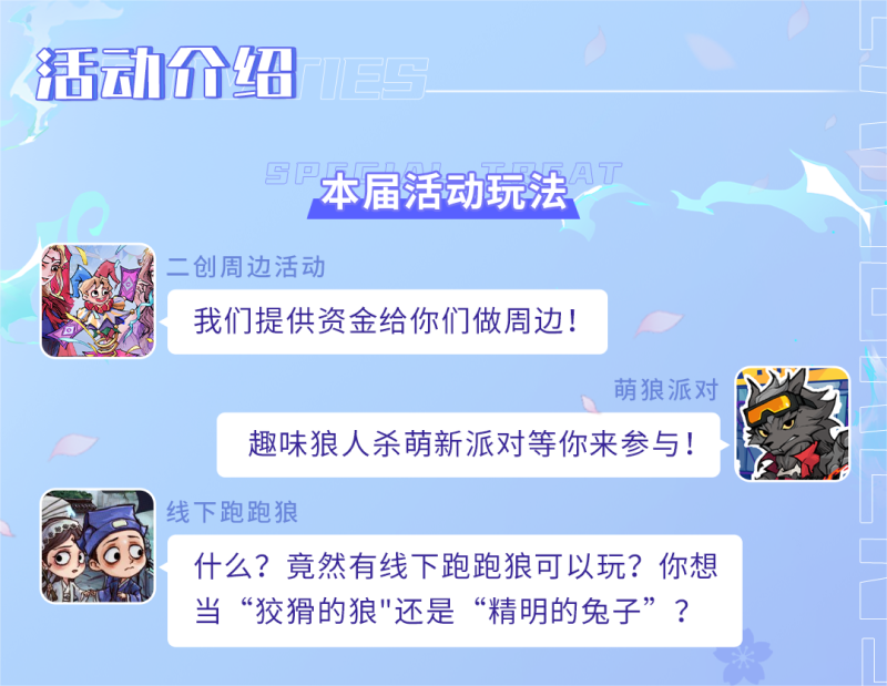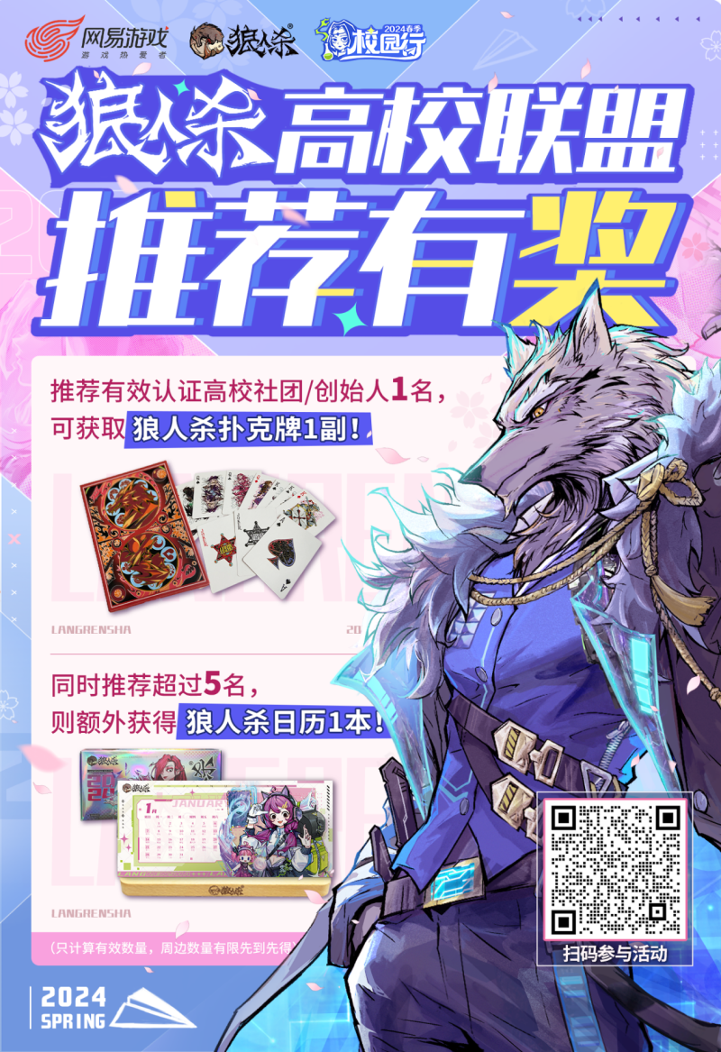 认识新同学,从一局狼人杀开始!2024狼人杀春季校园行活动火热招募中,为丰富高校学子业余生活,狼人杀走进校园为大家带来福利。本次活动诚邀狼人杀爱好者加入,成为狼人杀官方认证社团,还有机会获得现金扶持、游戏周边和丰厚物料支持! 【报名开启,加入官方认证即可申请】 2024年狼人杀春季校园行活动于2024年2月26日-2024年5月1日期间开放,本次活动面向全国高校狼人杀相关社团、组织进行招募,正规非狼人杀相关校内组织或没有校内正规组织的狼人杀爱好者可申请成为“高校创始人”作为代表申请活动。 申请社团须为狼人杀官方认证的高校社团。已认证的高校社团直接填写高校联盟群内校园行活动报名链接即可参与报名。未认证的高校社团或组织扫码填写认证信息,通过后即可报名。 【往期回顾,高校学子携手组局】 狼人杀校园行已经陪伴我们走过七年时间,收获了广大学子喜爱,在云南大学、浙江传媒学院、南京信息工程大学、晋中信息学院等国内多所高校都留下了美好回忆。 【全新趣味活动,创新玩法等你来挑战】 本次校园行活动新增全新趣味玩法,游戏更精彩,奖励更丰厚!二创周边活动登场,将为学子们提供资金支持;“萌狼派对”活动开启,趣味狼人杀萌新派对等你来参与;还有“线下跑跑狼”活动来袭,和伙伴一起线下跑跑狼! 【推荐有奖,周边礼物大放送】 狼人杀校园行活动推荐有奖活动同步开启,活动期间推荐有效认证高校社团或创始人即有机会获得狼人杀周边礼物! 【精彩赛事预告】 第四届狼人杀高校社团联赛即将来袭,2024狼人杀春季校园行活动中将同步开启高校比赛报名渠道,各位狼队友可以实时关注相关资讯,并报名参与活动,与其他高校的学子一较高下,敬请期待。 关于《狼人杀官方》—— 《狼人杀官方》一直以来致力于游戏玩法的打造,力求给玩家带来最满意最优质的玩法体验以及游戏环境,积极开拓全新玩法,女巫、守卫、摄梦人、魔术师、猎魔人等板子应有尽有。 三分钟爆笑推理,随时随地来一局,欢声笑语乐不停!实景操作古风Q萌小人嗨翻浪漫碎叶城,更有全新神职狼王和猎魔人惊喜加盟,更多逗趣任务等你来解锁!8人10人12人超多娱乐进阶模式,明星主播都在玩。快来狼人杀官方,和全网年轻人热闹组局! |