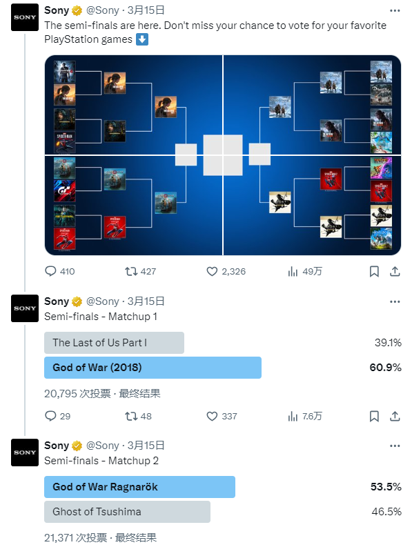 索尼的PlayStation平台一直凭借着优秀的第一方游戏来吸引玩家,近日索尼官方在推特上发起了票选PS平台“最具统治力”游戏的投票。 其中包含了《神秘海域4》、《最后的生还者》、《漫威蜘蛛侠》等第一方作品,以及《死亡搁浅》(限时独占)、《恶魔之魂 重置版》等独占作品。 但有不少玩家对于心中神作《血源诅咒》没有出现在名单中大感不满,甚至有玩家表示,之所以把《血源诅咒》踢出名单,是因为官方知道《血源诅咒》会“血洗”投票榜单。 不过索尼官方的本次票选已基本得出结果,《战神》(2018)和《战神:诸神黄昏》分别击败所遭遇的对手,成为进入最终角逐的游戏,无论胜负,赢家都将是“战神”。 |