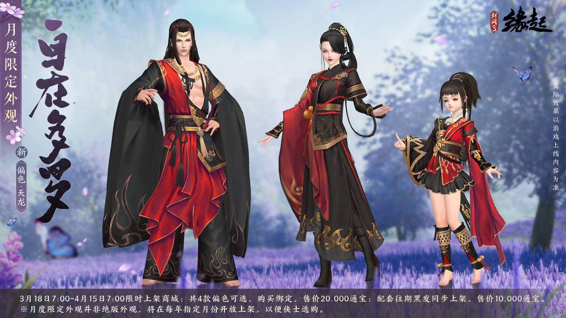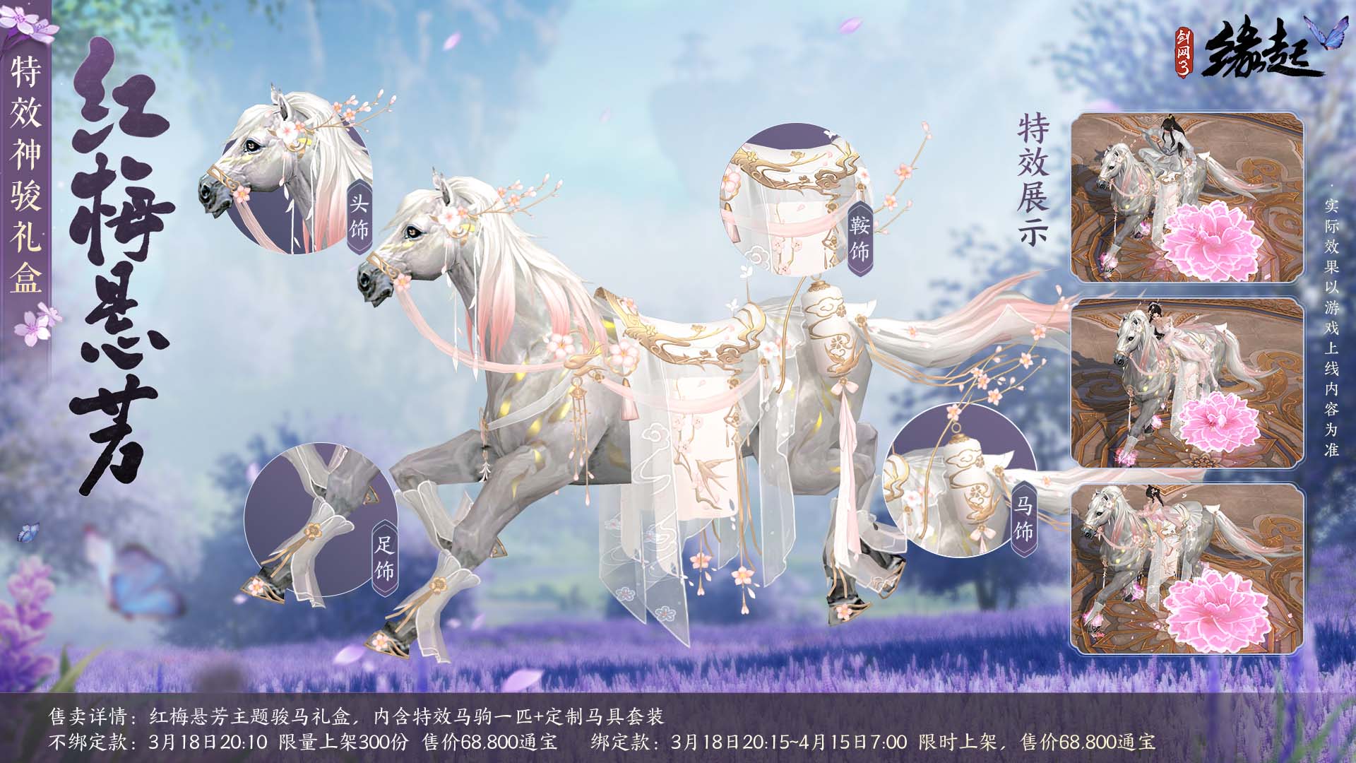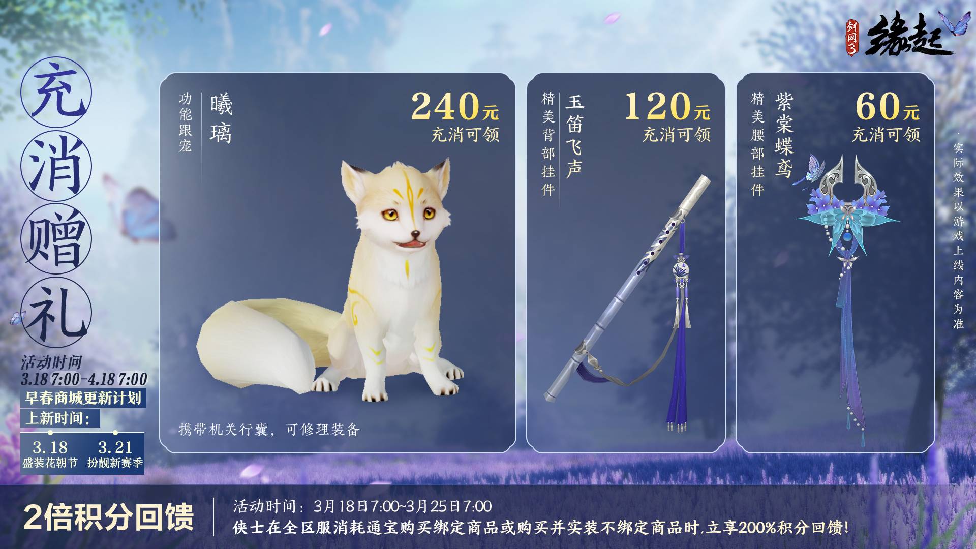 明媚花朝节,春暖醉人心。花朝节活动限时开启,精美不限时绑定挂件「春风度我」相送!花朝新品早春上架!踏青寻花主题礼盒「花照阡陌」、大侠优选外装礼盒「凤舞韶华」、特效神骏礼盒「红梅悬芳」、月度限定外装「自在多罗」系列华服美饰上架商城,欢迎侠士选购。同时,早春商城更新计划提前曝光,3月18日盛装花朝节,华美新装迎春来袭;3月21日扮靓新赛季,「千秋岁·皎灵素媚」系列披风、熊猫宝宝挂宠及人气NPC同款套装即将上架商城,以全新姿态迎接赛季新挑战! 【华美新裳迎春风】 花朝新衣娇艳丽,绚烂绽放春光里。花朝为花神生日,无雨百花熟。为迎接这样的好春光,春季新品上架商城,实装视频先睹为快! 踏青寻花礼盒「花照阡陌」 花朝时节踏翠青,绿衣纤舞春风中。花鸟纹案浮现于白纱之间,青蓝绢丝系带点缀前襟,萝莉燕形尾纱尽显俏皮,穿上它你就是大唐掌管可爱的神!成女素纱轻罩,尽显婀娜多姿;成男腰间更有美玉缀罗缨,更显端庄大气。 踏青主题礼盒「花照阡陌」包含动作特效成衣+定制白发+绑定版定制黑发+特效背部挂件「梨花入月」,分为绑定款和不绑定款。 不绑定款:将于3月18日20:05限量上架800份;绑定款将于3月18日20:15~4月15日7:00限时上架,售价均为52,000通宝。 大侠优选外装礼盒「凤舞韶华」 春风拂面凤羽翔,翩翩飞舞展华章,大侠优选外装礼盒「凤舞韶华」翩然而至。礼盒全身由柔纱制成,质如流水,纱上牡丹暗纹流动,若隐若现;凤凰呼之欲出,栩栩如生;成女更有凤凰羽翼点缀,华贵大方。 大侠优选外装礼盒「凤舞韶华」共五款偏色,分为标准版和豪华版,将于3月18日7:00~4月15日7:00限时上架,均为不绑定款。 标准版礼盒包含定制黑发一件和定制成衣一件,售价28,000通宝; 豪华版礼盒包含定制黑发一件、定制白发一件和定制成衣一件,售价38,000通宝。 特效神骏礼盒「红梅悬芳」 花开花落马蹄过,春色盎然醉人心。马蹄落处梅花隐隐浮现,幽香飘逸。奔马疾驰,梅花飘舞,蝶影婆娑,美丽绝伦。红梅悬芳主题骏马礼盒包含特效神驹一匹和同主题定制马具套装。 不绑定款限量300份,将于3月18日20:10上架,绑定款将于3月18日20:15~4月15日限时上架,两款售价均为68,800通宝。 月度限定外装「自在多罗」 经典外装「自在多罗」双色「颢天」、「炽盛」限时返场!两款新偏色「天龙」、「摩诃」同步登场。服饰版型简洁潇洒,独具特色,鎏金花纹耀眼夺目,尽显江湖侠士气息。 四款偏色均为限时不限量售卖,将于3月18日7:00~4月15日7:00上架商城,售价20,000通宝;往期两款偏色配套黑发也将同步限时上架,售价10,000通宝。 【全新冲销 惊喜不断】 全新功能跟宠「曦璃」惊喜登场!该宠物携带机关行囊,可协助侠士修理装备。3月18日7:00~4月18日7:00,充消达240元可领取不限时绑定小狐狸跟宠「曦璃」。侠士充消120元可领取精美背部挂件「玉笛飞声」,充消60元可领精美腰部挂件「紫棠蝶鸢」。 3月18日7:00至3月25日7:00活动期间,全区服消耗通宝购买绑定商品或购买并实装不绑定商品时,更可享受200%积分回馈! 【风光正好 踏青赏春】 繁花迎春艳,和风舞柳阴,花朝是游春扑蝶的好时候。3月18日7:00~4月1日7:00活动期间,侠士在各大主城活动区、万花落星湖、七秀青萝岛找到NPC苏水心参与节日活动即可获取活动代币「雨蝶鳞翅」,兑换花朝节节日不限时绑定腰挂「春风度我」!柳暗逢花明,春风可度我,愿君一世顺遂,平安喜乐。 还有往期奖励:跟宠「小刺」、节日背挂「清潇梨歌」、节日腰挂「长映朱颜」、节日腰挂「月下棠」等精美好礼等你来拿! 莺飞草长绿,春意自无阴。携友同踏青,共享乐无穷。大唐已然生机勃勃,花朝新品扮靓侠士与百花相映明艳夺目;节日限定活动更有精美挂件奖励相赠不容错过。 同时,「血战天策」将于本周四震撼公测,海量内容更新,给侠士不一样的江湖体验!快邀请亲朋好友一同畅游大唐,尽享大唐好风光,追忆往日江湖情! |