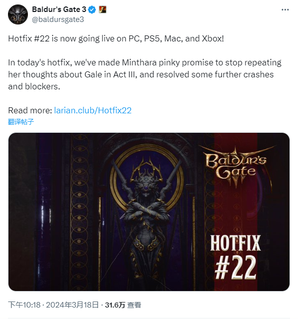 近日拉瑞安发文表示,22号热修补丁现已在PC、PS5、Mac和Xbox上正式推出,并且为Xbox平台的玩家提供了包含20号和21号热修的特别版更新补丁,这意味着《博德之门3》的跨平台存档功能将再次可用。