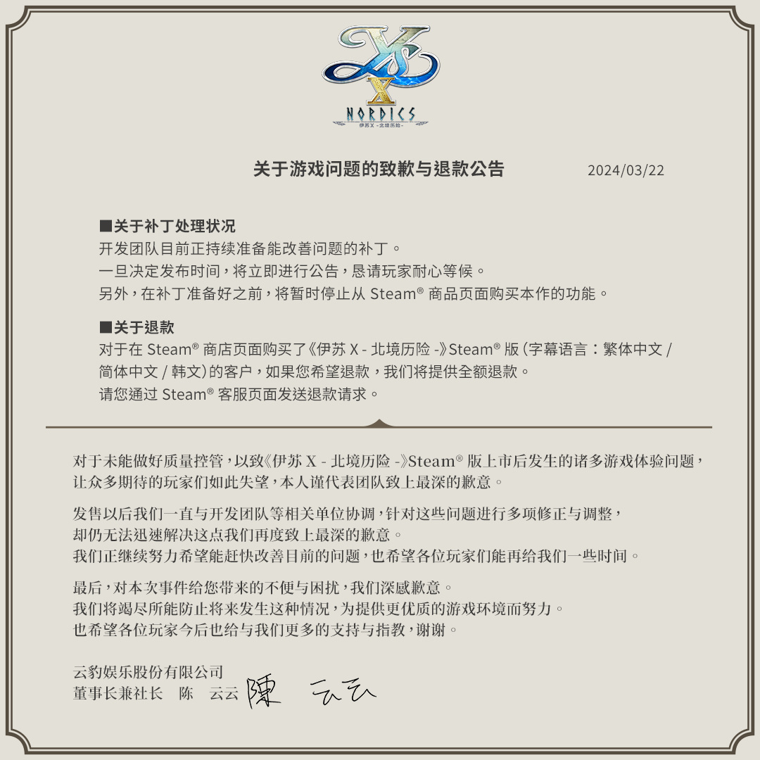 3月22日,针对《伊苏10》Steam中文版上线后的各种优化问题,云豹娱乐发布了致歉与退款声明,游戏目前已在Steam下架,停止销售,官方会在问题解决之后重新上架。截止目前,《伊苏10》Steam中文版的玩家评测为“多半差评”,好评率仅为29%。 云豹娱乐目前已经确定了《伊苏10》存在的三个严重问题: ·帧率极度下降 ·无法更改键盘操作配置,以及游戏中显示的键盘操作说明不正确 ·在游玩途中死机 目前官方正在开发修复补丁,再次开始销售的日期与时间将在之后公布。云豹娱乐为没有能做好质量管控,让众多期待的玩家感到失望而致歉,如果玩家希望退款,云豹娱乐将提供全额退款,玩家可以通过Steam客服页面发送退款请求。 |