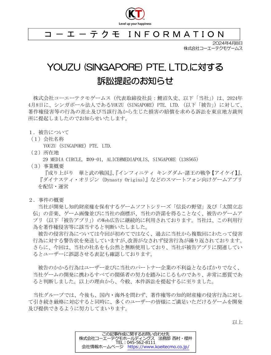 据日媒4Gamer报道,近日光荣特库摩向东京地方法院起诉,指控游族新加坡分公司侵犯著作权,并要求后者停止侵权、赔偿损失。