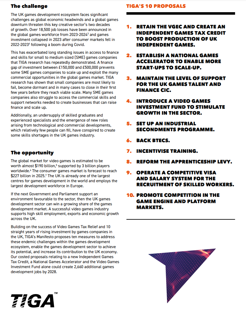 英国游戏贸易协会TIGA近日发布了“10项宣言”,包含设立游戏投资基金、新增2660个游戏开发职位、呼吁推出独立游戏税收抵免等措施和建议。 TIGA的宣言是基于“最新的和近来的主要研究、对TIGA成员和更广泛的视频游戏行业的调查,以及与游戏开发商的大量讨论”的,对此Rebellion首席执行官兼创意总监兼TIGA主席Jason Kingsley CBE表示:“在技术与创造力融合的时代,视频游戏行业是创新和经济活力的灯塔。” 其中的独立游戏税收抵免建议提到,制作预算低于1500万英镑的游戏可以在80%的合理支出中申请53%的抵免,从而使英国的游戏行业发展形式与加拿大、法国、比利时等国家更加一致。 |