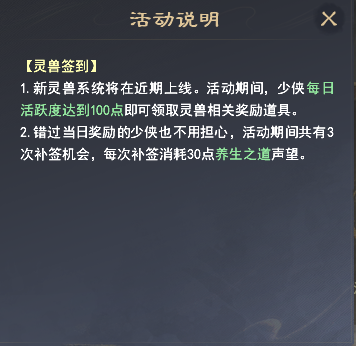五一小长假欢乐来袭,各处旅游观光景点人山人海,少侠不妨来大荒放松度假,不仅有浮生偷闲系列活动,携限定贴纸、表情动作,邀你上线休闲一“夏”,更有限定福利活动【灵兽签到】开启,即日起-5月7日,少侠动手签签到,便能免费领取,大量的灵兽培养道具奖励!这样简简单单便能获取的节日福利,本天不允许任何一位少侠错过,话不多说,下面一起来看看更多活动细节吧! 少侠通过完成各项日常任务、节日活动 达到100活跃度后 便可点击游戏界面 右上角处的【灵兽签到】按钮 进入签到页面 右键【领取】便可解锁 当日的活动奖励啦~ 连续七天,每天完成签到 都能领取到免费的灵兽培养道具 岩烧铁甲、亲密丹、高级洗心石、神通卷…… 若坚持签至第七天 还有【自选灵兽蛋】免费赠予你! 待新灵兽系统上线后 少侠右键打开灵兽蛋 即可在十二只灵兽中一只进行领养,若与本天一样有“选择困难症”的少侠,不妨先提前想想,以便届时能尽早把灵兽带回家。 若不小心错过了当天的签到,少侠也不必担心,你可在活动期间,消耗30点养生之道声望进行补签,一共有三次补签机会,大家记得不要错过。 少侠酒足饭饱后闲来无事,不妨登陆游戏前来签到,领免费好礼!大家可提前准备好培养道具,迎接5月8日新灵兽的到来。 |