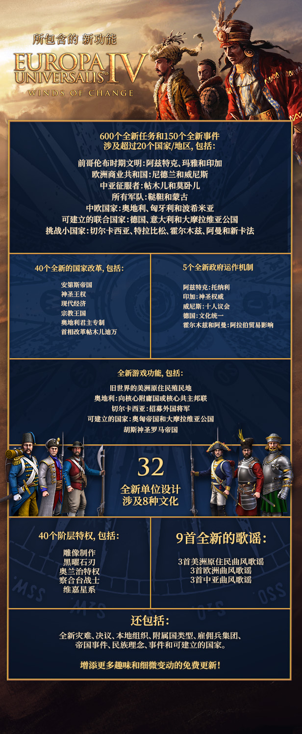 P社经典4X大战略游戏《欧陆风云4》,近日正式推出了全新DLC《变革之风(Winds of Change)》,并在Steam平台收获多半好评。 《变革之风》目前暂不支持中文,Steam国区售价98元。 DLC简介: 《欧陆风云4》的这个扩展包主要聚焦于世界上的三个地区,这几个地区都因早期现代世界的快速变化而发生了巨变。在美洲,若干个地区性的帝国正在巩固自己的地位,因为一种新的威胁正准备颠覆他们的社会。在欧洲,宗教改革、新的贸易路线以及原始的民族主义精神的兴起,正促使老牌国家进行改革,并为有着经济头脑的人提供了有利可图的机会。而在中亚,由于蒙古势力的衰弱,导致许多国家都争相填补权力的真空。 变革之风使得从安第斯高原到蒙古大草原的20个国家发生了广泛的变化。游戏中新增了许多分支任务、政府改革、事件、财产特权等,其中包括戏剧性的改变游戏选项,例如将帖木儿帝国恢复至游牧社会,进行光荣革命以统一荷兰和英国王室,或者带领美洲土著入侵欧洲。 除了数百个新任务以外,《变革之风》还对以下方面进行了独特的改动: · 阿兹特克帝国:全新的“托纳利”机制,鼓励战争与牺牲。实现对松散的附属帝国进行中央集权,开展新的政府改革,包括著名的浮园耕作法。 ·玛雅民族:建立一个统一的玛雅民族联邦,在尤卡坦半岛的热带地区发展壮大,并将你的联邦集权为一个更强大的王国以迎接即将到来的风暴。 ·印加帝国:从库斯科开始扩张,征服或殖民附近的领地,抵抗木乃伊统治者的传统力量并管理印加帝国的威权。 ·荷兰:探索更多以经济为主题的政府改革与决策,参与省督和君主之间的权力斗争,或者通过光荣革命转向英国国家价值理念。 ·威尼斯:在新的政府机制中抵抗或屈从于十人委员会的权力,建立黄金共和国,享受威尼斯文艺复兴的文化力量。 ·奥地利:在新的“普世帝国”事件中作出关键性的决策,建立奥匈帝国变体国家,从十几个分支任务中做出选择,并使用新的外交选项。 ·匈牙利和波希米亚:通过独特的匈牙利政府改革与决策、波希米亚新的胡斯主题内容,以及组建大摩拉维亚国的能力来抵抗帝国统治。 ·帖木儿:继续以骑兵为主导的征服模式或巩固在波斯的权力,建立新的政府改革,包括掠夺经济、新的索尤加尔附属国类型及以中国的征服行为作为宣战理由。 ·莫卧儿:在战场上取得的胜利将有助于你完成使命,在这个丰富多样的地区上扩大你的权力。你可以在推广君权的同时,推广融合的神教以降低狭隘现象,并接受新的改革,包括曼萨卜达尔军官制度。 ·游牧民族:通过宗教分支任务,以及根据部落初始点(蒙古、鞑靼或莫卧儿汗国)的数十个特定任务来制定信仰相关的决定。 ·德国和意大利:通过新的政府改革与特色内容,联合各自的文化群体,建立主要的欧洲国家。 ·切尔卡西亚和特拉比松:在充满挑战,遍地都是拥有强权和强军的列强环境中,加强并复兴东正教在黑海的势力。 ·新卡法和霍尔木兹/阿曼:通过新卡法的阿尤布复兴任务,和霍尔木兹/阿曼以贸易为导向的理念,从波斯湾向外扩张。 |