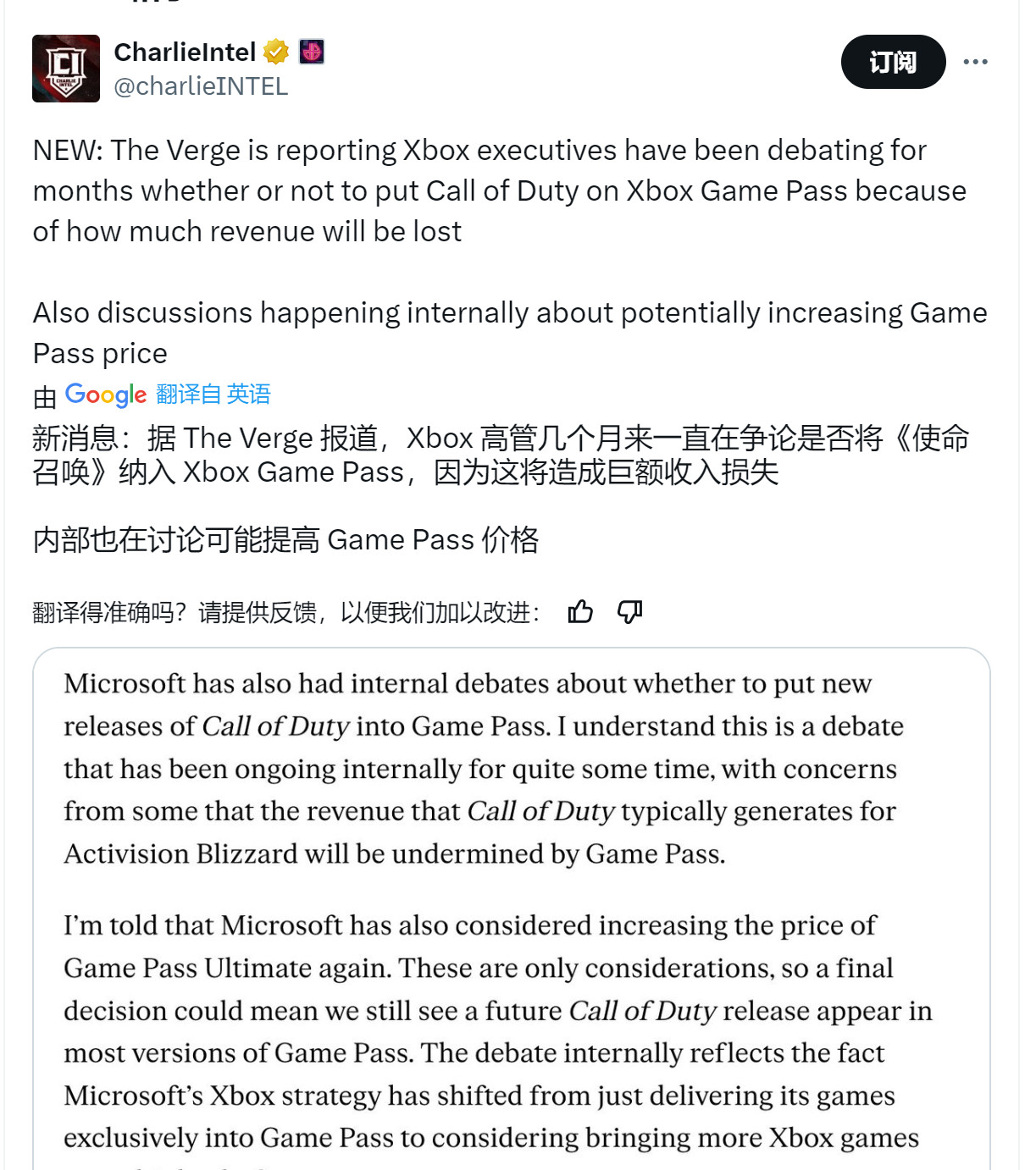 在微软收购动视暴雪后,许多人猜测这家科技巨头是否会遵循其惯例,即在游戏首发当天就把其自家游戏加入到 Game Pass服务中。具体来说,这其中就包括过去几年里最赚钱的游戏之一——《使命召唤》系列。 然而,一份新的报告指出,将《使命召唤》系列新作加入到Game Pass目前仍然是Xbox内部讨论的话题,据报道,微软还正在考虑再次提高Game Pass服务价格。 今天,知名记者Tom Warren在The Verge发布了一份新报告,称微软内部对于将新款《使命召唤》加入其游戏订阅服务Game Pass仍存在争议。Warren称,这场争论在公司内部已经“持续了相当长一段时间”。反对这一想法的人认为,通过Game Pass发行新游戏会 “削弱动视暴雪(以及微软)的《使命召唤》收入”。 更有趣的是,Warren写道,微软还“考虑”提高Xbox Game Pass Ultimate版本的订阅价格。和《使命召唤》新作加入Game Pass 一样,涨价目前也仅处于讨论阶段,尚未最终确定。不过,Warren推测,涨价可能意味着未来的《使命召唤》新作将出现在“大多数版本的Game Pass”上。 《使命召唤》作为一个系列,无疑是游戏行业最赚钱的IP之一,而且已经有相当长的一段时间了。《使命召唤》盈利能力的几个例子包括:2022年,《使命召唤:现代战争2》成为该系列中最快突破10亿美元大关的游戏;就在去年,作为美国联邦贸易委员会对微软审判的一部分,IGN通过一份法庭文件了解到,2021年,《使命召唤》仅仅是PS版本,就在美国“直接创造了超过8亿美元的收入”。 |