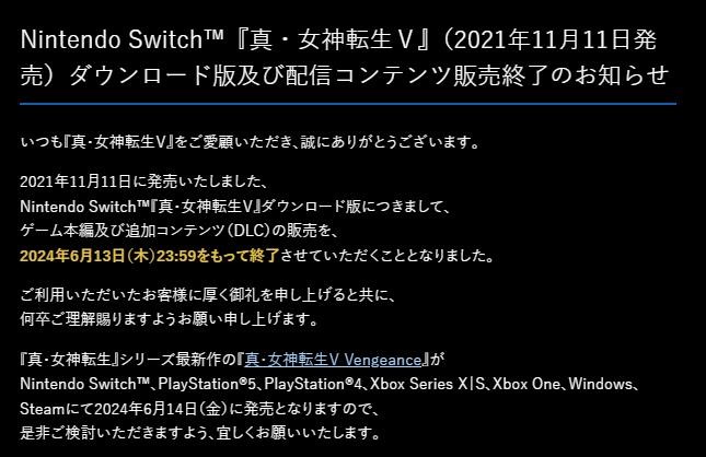 5月13日,开发商Atlus宣布Switch版《真女神转生5》及其DLC将于6月13日23:59停止销售,该作于2021年11月11日在Switch上发售,已购买的玩家在游戏停售之后仍可以正常下载游玩。