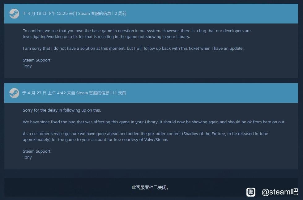 近日百度Steam吧一位玩家反映,因Steam系统出现Bug,他无法启动游戏库里的《艾尔登法环》。没法重温游戏让他很着急,就跟客服反映了该情况,客服表示要修复该问题需要等待。 一个月后这个问题终于解决了,这位玩家又能愉快游玩《艾尔登法环》了。之后他想预购DLC“黄金树之影”,结果发现DLC已经在库里了。原来是官方为表歉意,竟然赠送了这款DLC。这位玩家高兴坏了,血赚198元! 评论区有人表示:“客服真好,还送一份礼物”“这客服服务没得说,你的运气也不错,恭喜了!”“我不信,除非也给我一份。” 《艾尔登法环》DLC“黄金树之影”将于6月21日上线,售价198元。该DLC以“幽影之地”为舞台,伴随着多种新增要素(令人战栗的地下迷宫、充满威胁性的敌人,以及新增的武器、防具等等),交织出另一段故事。探索未知、挑战困难,享受克服困境时的成就感吧。登场角色之间的利害关系谱成的群像剧,更是不容错过。 |
