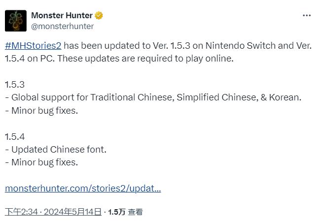 5月14日,卡普空为《怪物猎人物语2:破灭之翼》发布了新版本更新,PC版更新至1.5.4版本,Switch版更新至1.5.3版本,其中除了Bug修复外,PC版为游戏更新中文字体,Switch版新增了全区中文支持,此前Switch只有港版和日版游戏才支持中文,现在欧版和美版也支持中文了。 《怪物猎人物语2:破灭之翼》是由卡普空开发发行的角色扮演游戏,于2021年7月9日全球发售,登陆了Switch和PC,是3DS续作《怪物猎人物语》的续作,玩家将在游戏中扮演一位能够与怪物建立牵绊、培育怪物、与怪物共存的“怪物骑士”,造访各种各样的地方,通过故事与任务尽情体验“怪物猎人”世界。 |