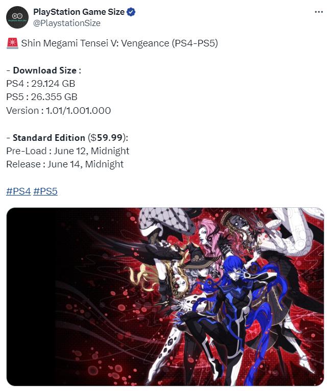 5月21日,知名爆料推主PlayStation Game Size发文爆料了《真女神转生5:复仇》PlayStation版下载大小和预载时间,《真女神转生5:复仇》PS4版下载大小29.124GB,PS5版下载大小26.355GB,游戏将于6月12日开始预加载,6月14日正式解锁。 《真女神转生5:复仇》是2021年Switch游戏《真女神转生5》的加强版系统,剧情及恶魔体验等诸多方面全面升级。主角是一名高中生少年。某日,在一个奇妙的梦境中,他面临一个抉择,他将决定是否要救助某个被封印的少女。这一抉择,将故事分为两个篇章。 在“创世女神篇”中,玩家可游玩《真女神转生5》中的故事。少年将被卷入天使与恶魔的战争,并投身于赌上世界未来的战斗。 在“复仇女神篇”中,玩家可体验受压迫者们的复仇记。少年将在化为一片沙漠的东京邂逅某个少女,与她一起向这个世界的谜团发起挑战。 |